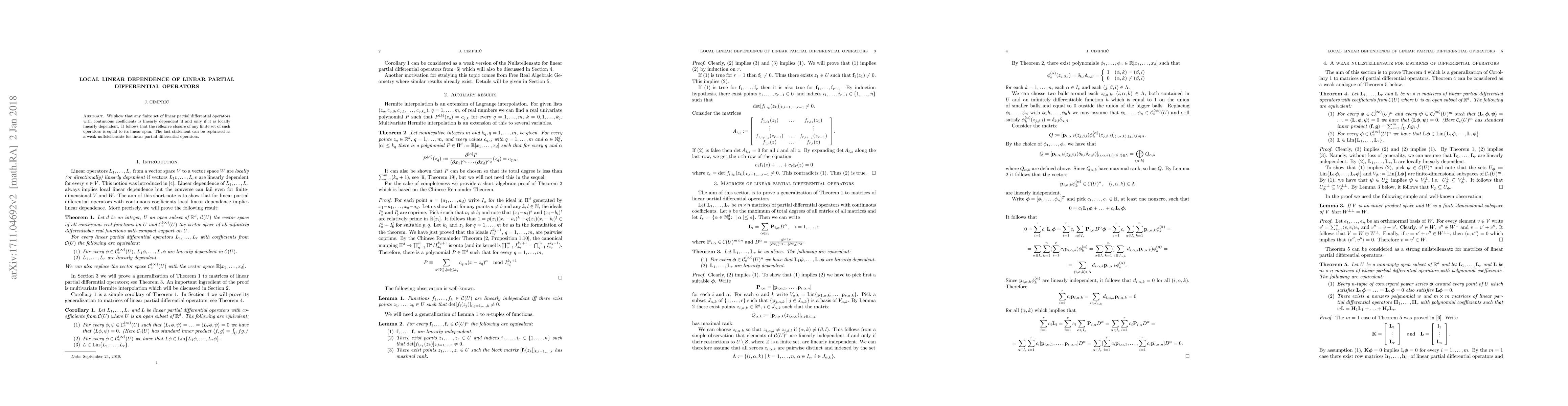 This paper demonstrates that a finite set of linear partial differential operators with continuous coefficients is globally linearly dependent if and only if it is locally linearly dependent. Consequently, the reflexive closure of such a set equals its linear span, establishing a weak nullstellensatz for these operators.