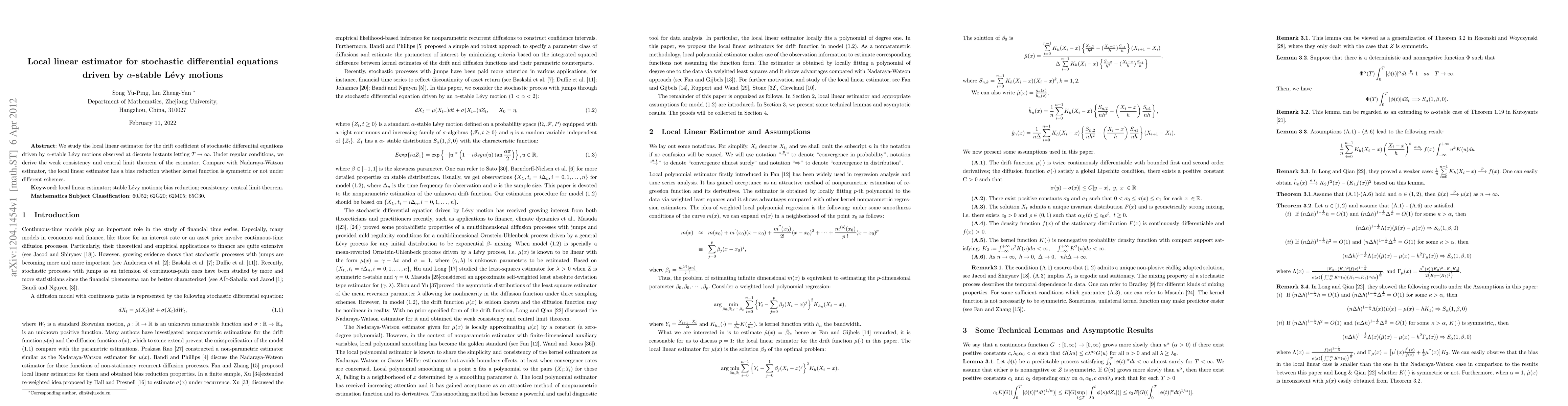 Summary: This paper investigates the local linear estimator for the drift coefficient of stochastic differential equations driven by $\alpha$-stable Lévy motions, proving its weak consistency and central limit theorem. It demonstrates that the local linear estimator reduces bias compared to the Nadaraya-Watson estimator, regardless of kernel symmetry.