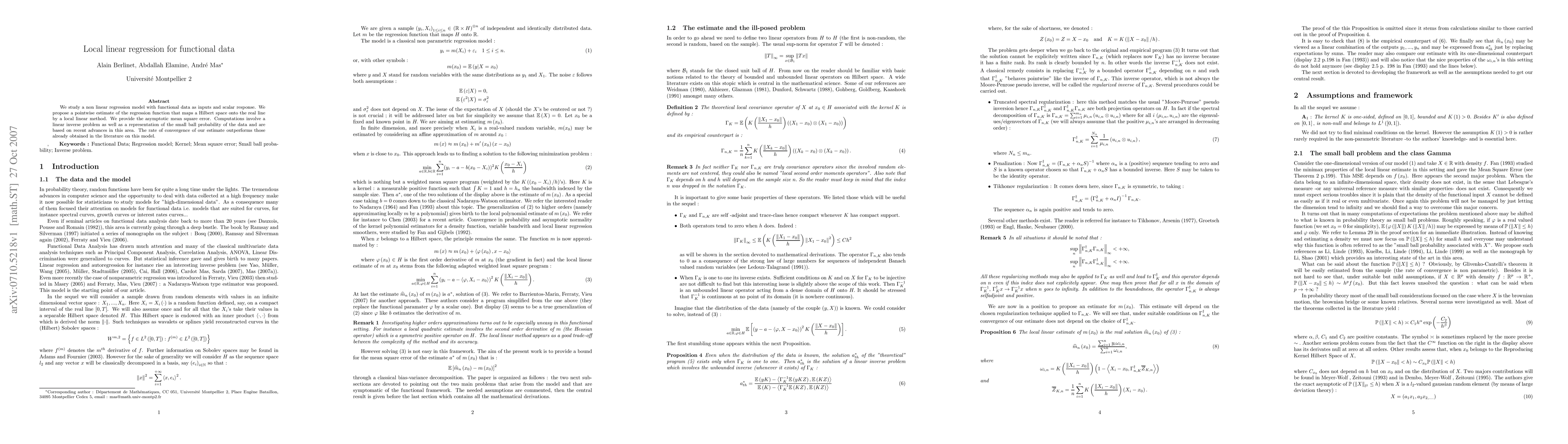This paper proposes a local linear regression method for functional data, providing a pointwise estimate of the regression function with improved convergence rates compared to existing methods. The approach involves solving a linear inverse problem and utilizes recent advances in the representation of small ball probabilities.