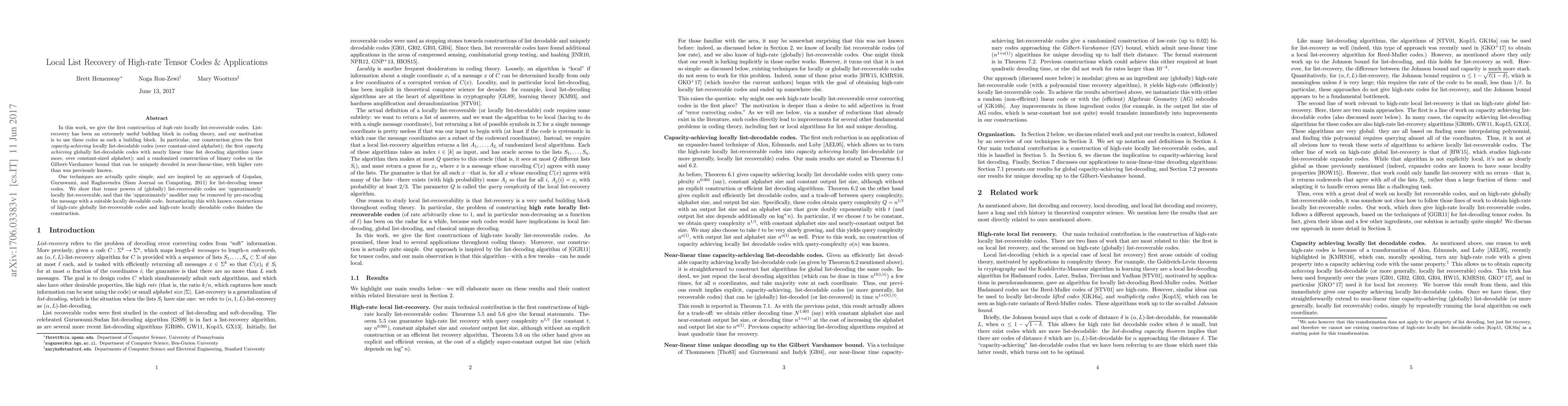 This paper constructs high-rate locally list-recoverable codes, achieving capacity for both locally and globally list-decodable codes over constant-sized alphabets, and presents a near-linear-time decoding algorithm. The techniques leverage tensor powers of list-recoverable codes and pre-encoding with locally decodable codes.