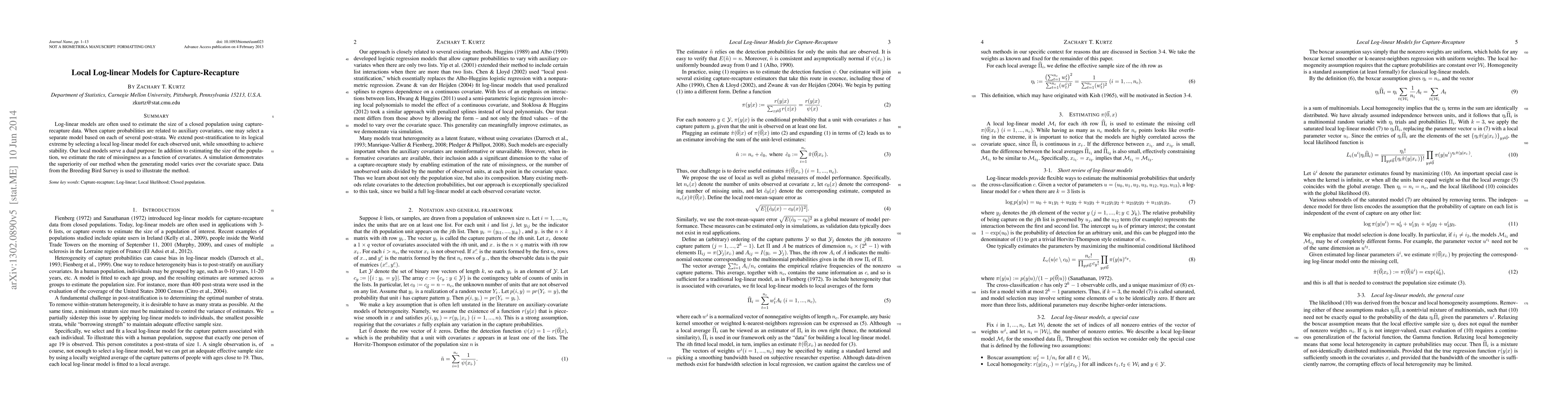 This paper proposes a method using local log-linear models for estimating population size from capture-recapture data, where each observed unit has its own model, smoothed for stability. The approach also estimates the missingness rate based on covariates, demonstrating superior performance through simulations and application to Breeding Bird Survey data.