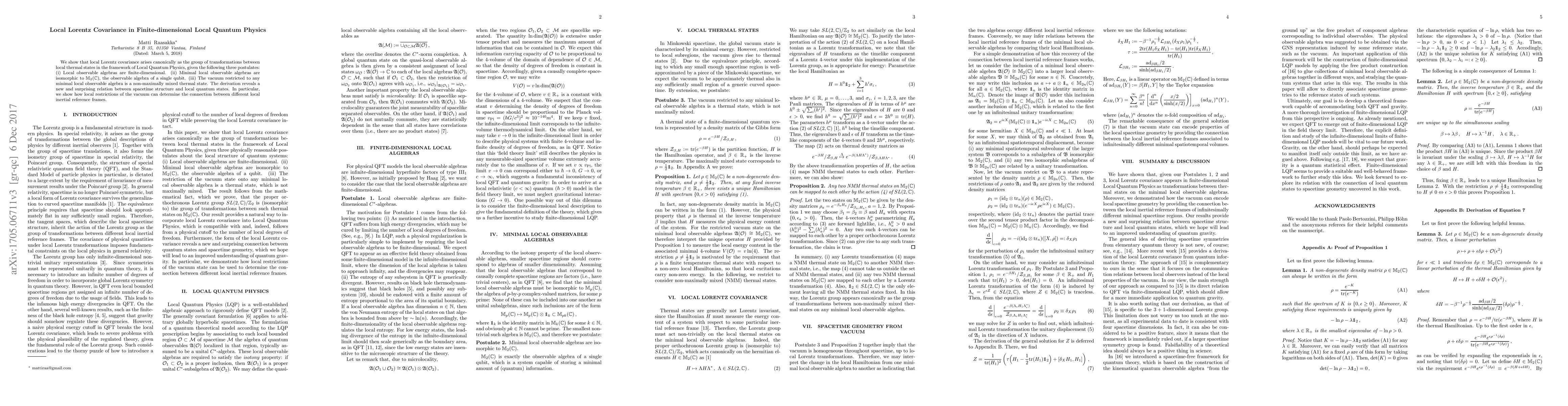 The paper demonstrates that local Lorentz covariance naturally emerges from the framework of finite-dimensional Local Quantum Physics through transformations between local thermal states, revealing a novel link between spacetime structure and local quantum states, particularly how vacuum restrictions influence transitions between inertial frames.