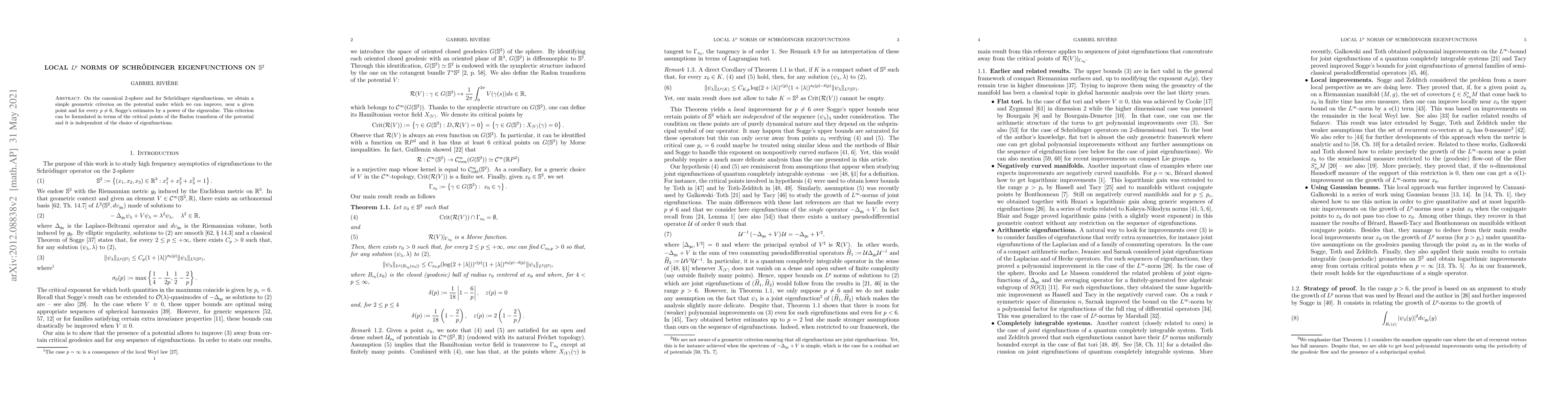 On the canonical $2$-sphere and for Schr{\"o}dinger eigenfunctions, we obtain a simple geometric criterion on the potential under which we can improve, near a given point and for every $p\neq 6$, Sogge's estimates by a power of the eigenvalue. This criterion can be formulated in terms of the critical points of the Radon transform of the potential and it is independent of the choice of eigenfunctions.
