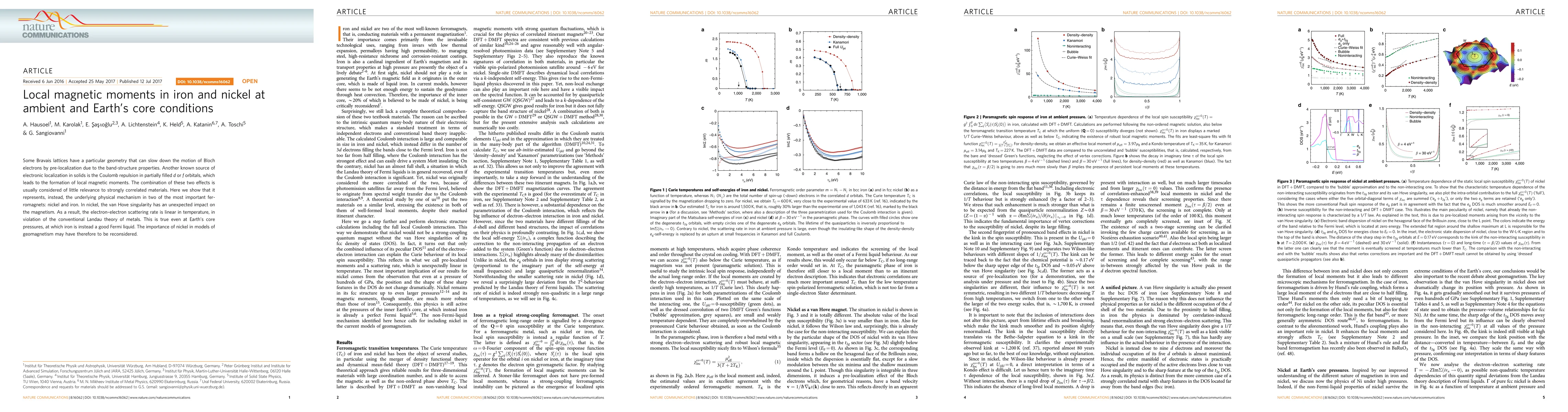 This paper investigates the magnetic moments in iron and nickel under ambient and extreme Earth's core conditions, revealing that electronic localization due to band-structure and Coulomb repulsion significantly influences their magnetism. Nickel's magnetism is affected by a van Hove singularity, leading to a temperature-dependent electron-electron scattering rate, challenging conventional metal theories even at high pressures.