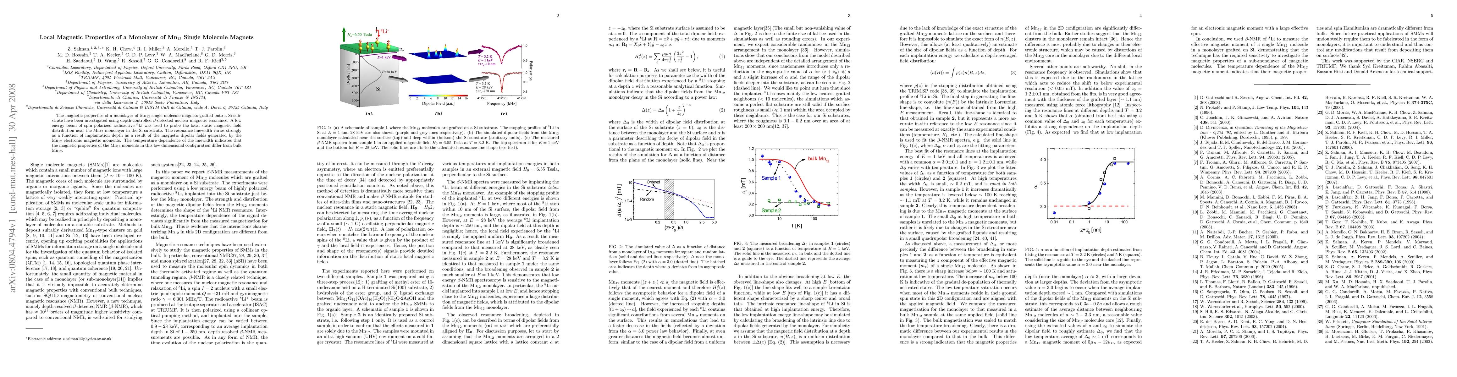 The magnetic properties of a monolayer of Mn12 single molecule magnets grafted onto a Si substrate have been investigated using depth-controlled $\beta$-detected nuclear magnetic resonance. A low energy beam of spin polarized radioactive 8Li was used to probe the local static magnetic field distribution near the Mn12 monolayer in the Si substrate. The resonance linewidth varies strongly as a function of implantation depth as a result of the magnetic dipolar fields generated by the Mn12 electronic magnetic moments. The temperature dependence of the linewidth indicates that the magnetic properties of the Mn12 moments in this low dimensional configuration differ from bulk Mn12.