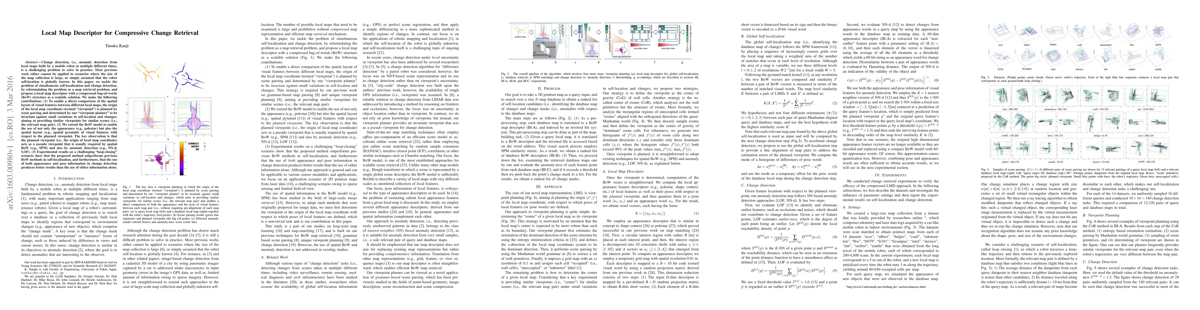 Change detection, i.e., anomaly detection from local maps built by a mobile robot at multiple different times, is a challenging problem to solve in practice. Most previous work either cannot be applied to scenarios where the size of the map collection is large, or simply assumed that the robot self-location is globally known. In this paper, we tackle the problem of simultaneous self-localization and change detection, by reformulating the problem as a map retrieval problem, and propose a local map descriptor with a compressed bag-of-words (BoW) structure as a scalable solution. We make the following contributions. (1) To enable a direct comparison of the spatial layout of visual features between different local maps, the origin of the local map coordinate (termed "viewpoint") is planned by scene parsing and determined by our "viewpoint planner" to be invariant against small variations in self-location and changes, aiming at providing similar viewpoints for similar scenes (i.e., the relevant map pair). (2) We extend the BoW model to enable the use of not only the appearance (e.g., polestar) but also the spatial layout (e.g., spatial pyramid) of visual features with respect to the planned viewpoint. The key observation is that the planned viewpoint (i.e., the origin of local map coordinate) acts as a pseudo viewpoint that is usually required by spatial BoW (e.g., SPM) and also by anomaly detection (e.g., NN-d, LOF). (3) Experimental results on a challenging "loop-closing" scenario show that the proposed method outperforms previous BoW methods in self-localization, and furthermore, that the use of both appearance and pose information in change detection produces better results than the use of either information alone.