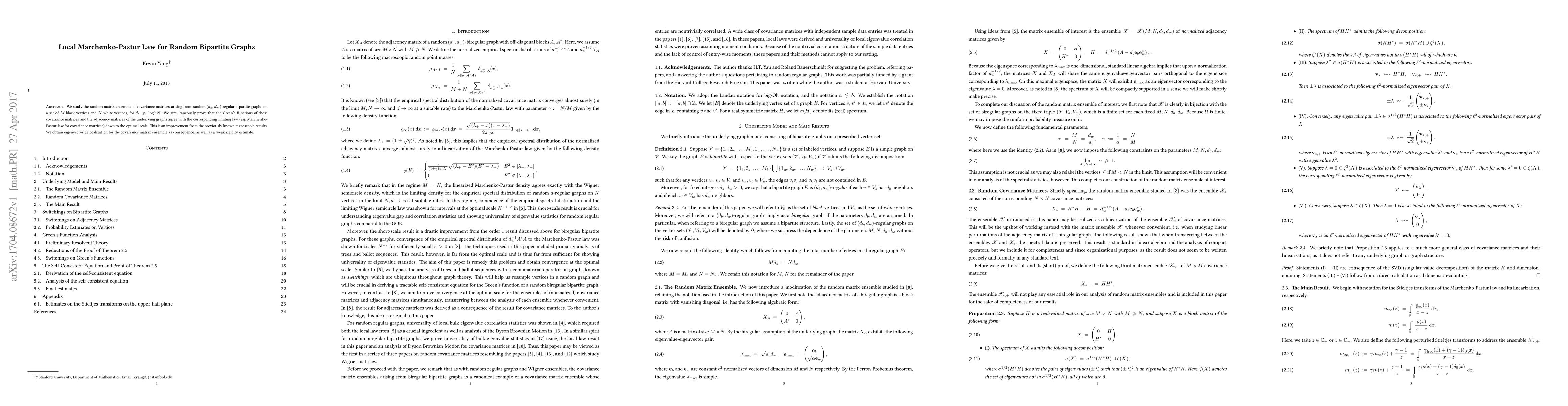 This paper investigates the covariance matrices derived from $(d_b, d_w)$-regular bipartite graphs, proving the local Marchenko-Pastur Law and achieving optimal agreement with limiting laws for Green's functions and adjacency matrices, while also demonstrating eigenvector delocalization and weak rigidity.