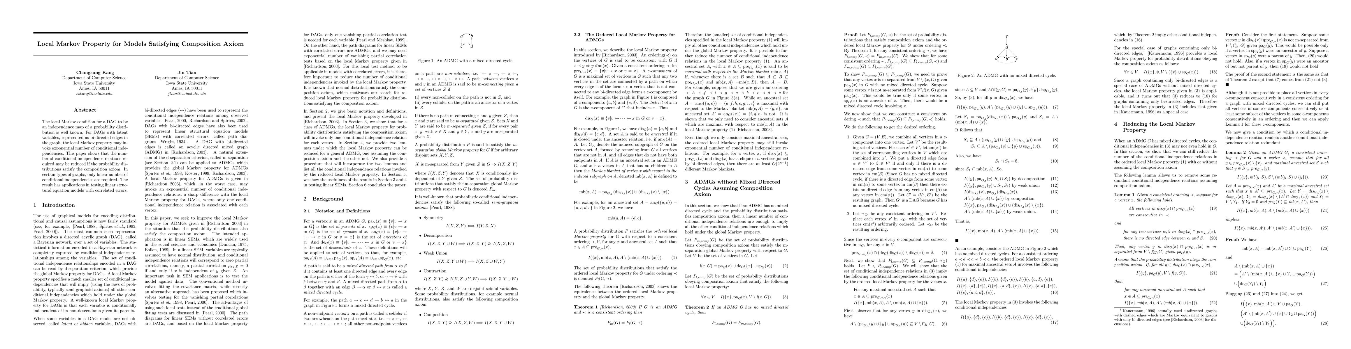 The local Markov condition for a DAG to be an independence map of a probability distribution is well known. For DAGs with latent variables, represented as bi-directed edges in the graph, the local Markov property may invoke exponential number of conditional independencies. This paper shows that the number of conditional independence relations required may be reduced if the probability distributions satisfy the composition axiom. In certain types of graphs, only linear number of conditional independencies are required. The result has applications in testing linear structural equation models with correlated errors.