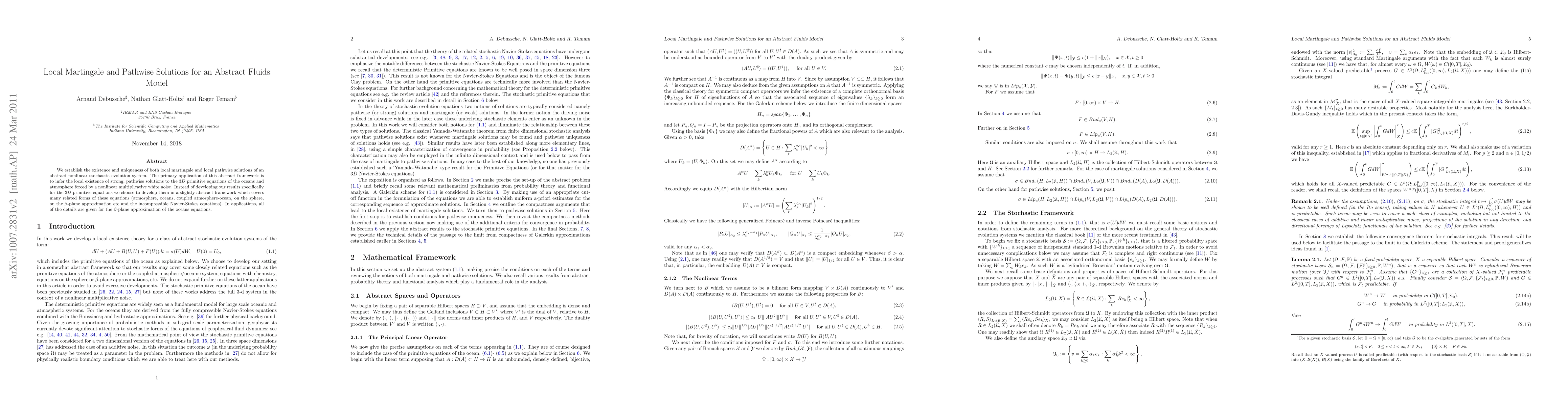 We establish the existence and uniqueness of both local martingale and local pathwise solutions of an abstract nonlinear stochastic evolution system. The primary application of this abstract framework is to infer the local existence of strong, pathwise solutions to the 3D primitive equations of the oceans and atmosphere forced by a nonlinear multiplicative white noise. Instead of developing our results specifically for the 3D primitive equations we choose to develop them in a slightly abstract framework which covers many related forms of these equations (atmosphere, oceans, coupled atmosphere-ocean, on the sphere, on the {\beta}-plane approximation etc and the incompressible Navier-Stokes equations). In applications, all of the details are given for the {\beta}-plane approximation of the oceans equations.