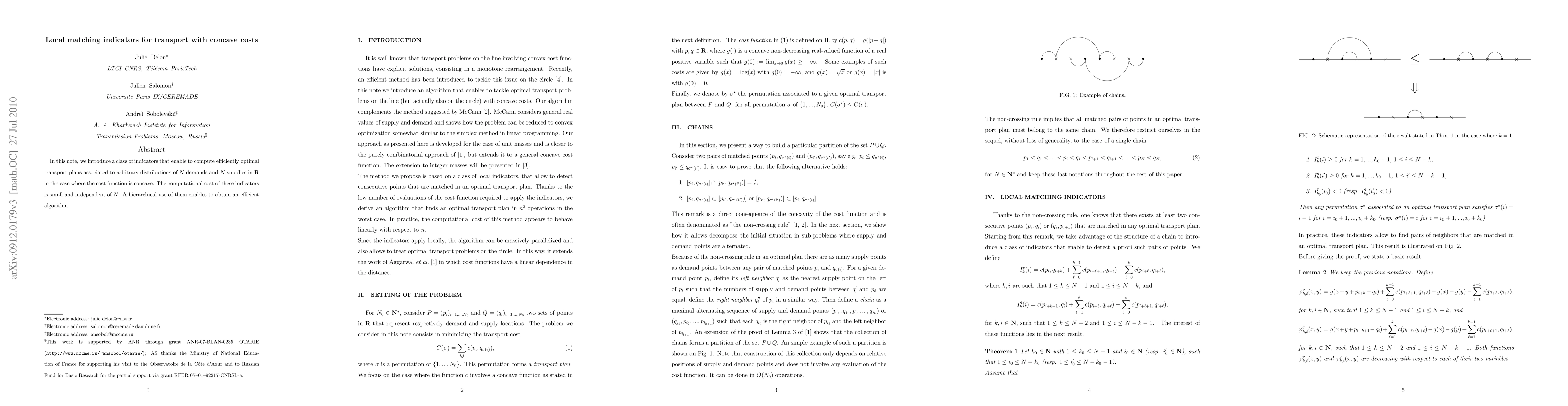 In this note, we introduce a class of indicators that enable to compute efficiently optimal transport plans associated to arbitrary distributions of $N$ demands and $N$ supplies in $\mathbf{R}$ in the case where the cost function is concave. The computational cost of these indicators is small and independent of $N$. A hierarchical use of them enables to obtain an efficient algorithm.