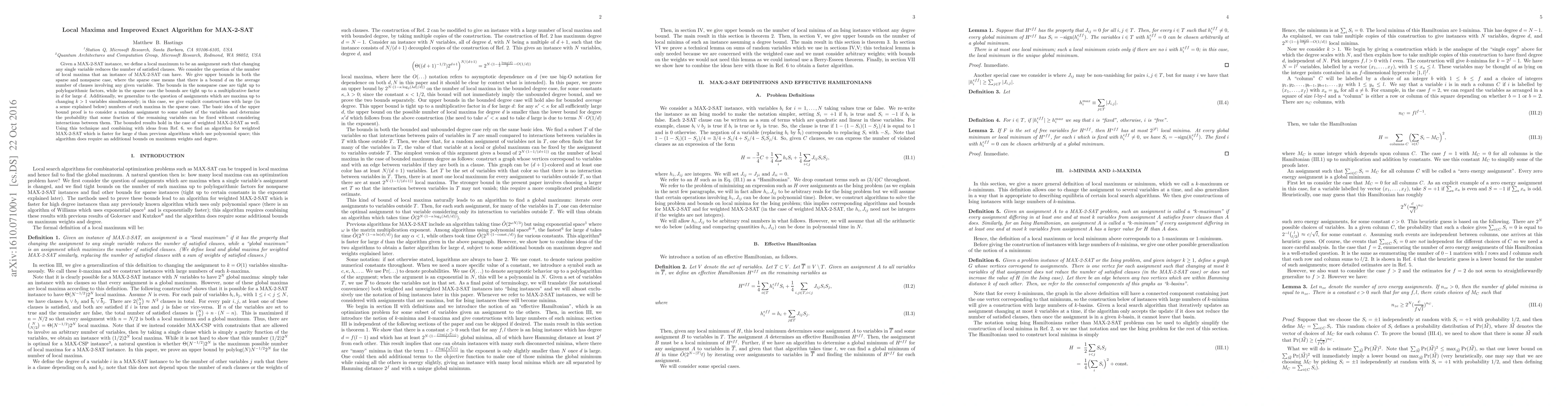 Given a MAX-2-SAT instance, we define a local maximum to be an assignment such that changing any single variable reduces the number of satisfied clauses. We consider the question of the number of local maxima that an instance of MAX-2-SAT can have. We give upper bounds in both the sparse and nonsparse case, where the sparse case means that there is a bound $d$ on the average number of clauses involving any given variable. The bounds in the nonsparse case are tight up to polylogarithmic factors, while in the sparse case the bounds are tight up to a multiplicative factor in $d$ for large $d$. Additionally, we generalize to the question of assignments which are maxima up to changing $k> 1$ variables simultaneously; in this case, we give explicit constructions with large (in a sense explained below) numbers of such maxima in the sparse case. The basic idea of the upper bound proof is to consider a random assignment to some subset of the variables and determine the probability that some fraction of the remaining variables can be fixed without considering interactions between them. The bounded results hold in the case of weighted MAX-2-SAT as well. Using this technique and combining with ideas from Ref. 6, we find an algorithm for weighted MAX-2-SAT which is faster for large $d$ than previous algorithms which use polynomial space; this algorithm does require an additional bounds on maximum weights and degree.