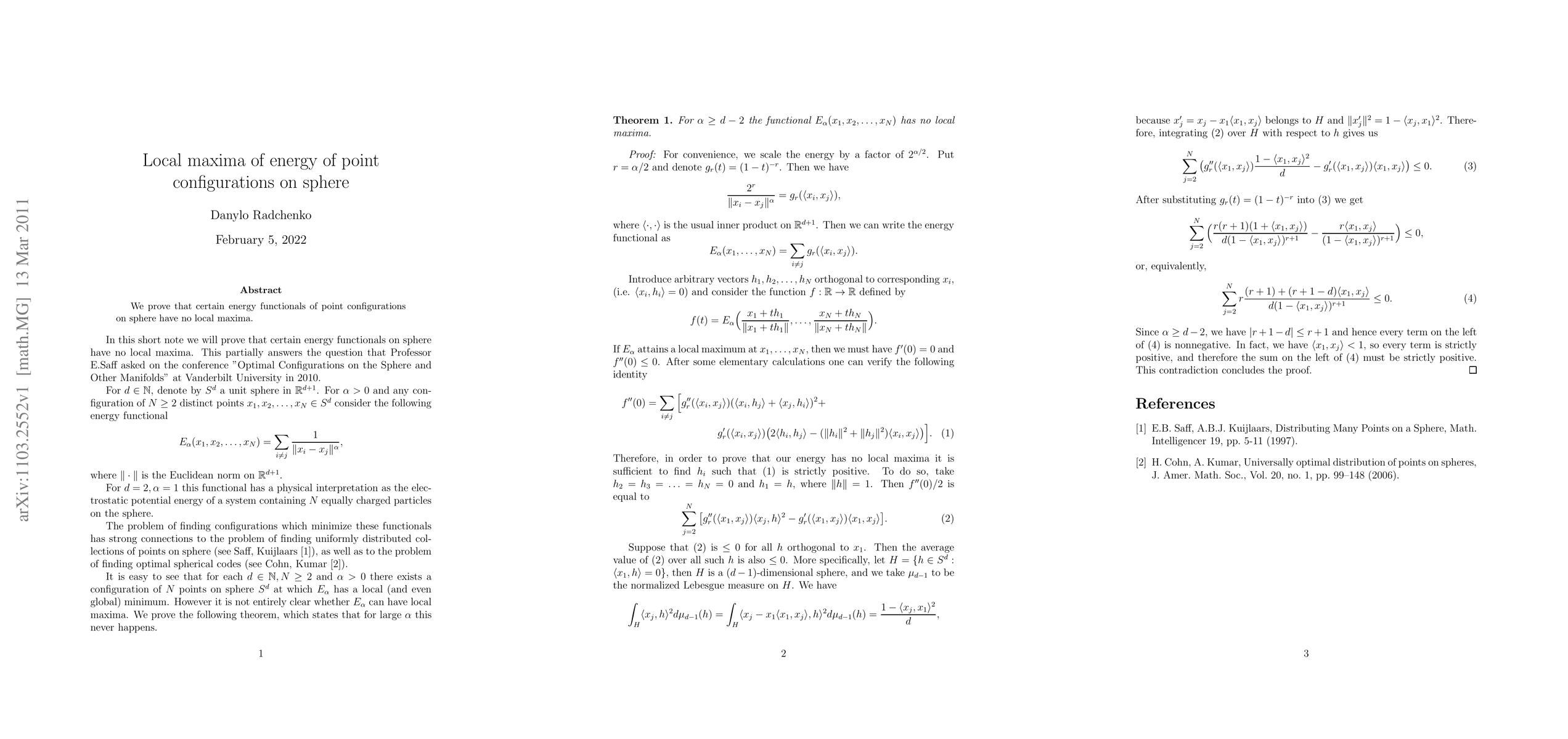 Researchers prove certain energy functionals on a sphere have no local maxima, offering new insights into point configurations.