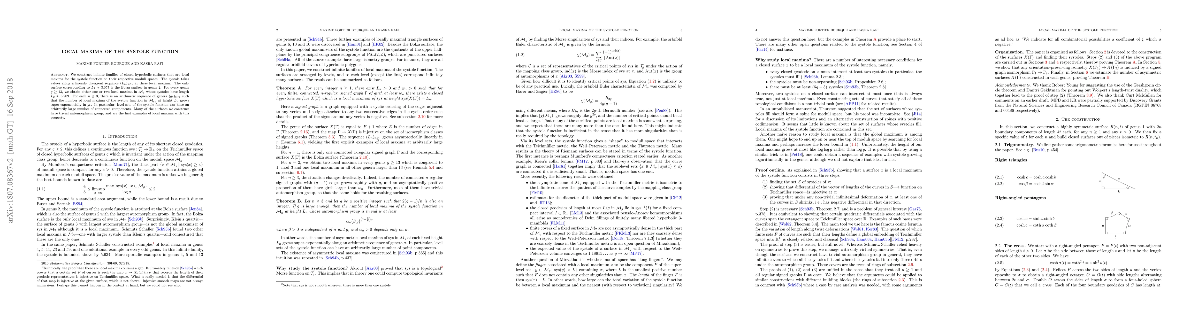 Researchers have found infinite families of hyperbolic surfaces that are local maxima for the systole function, with some surfaces having arbitrarily large numbers of connected components, and others having trivial automorphism groups.