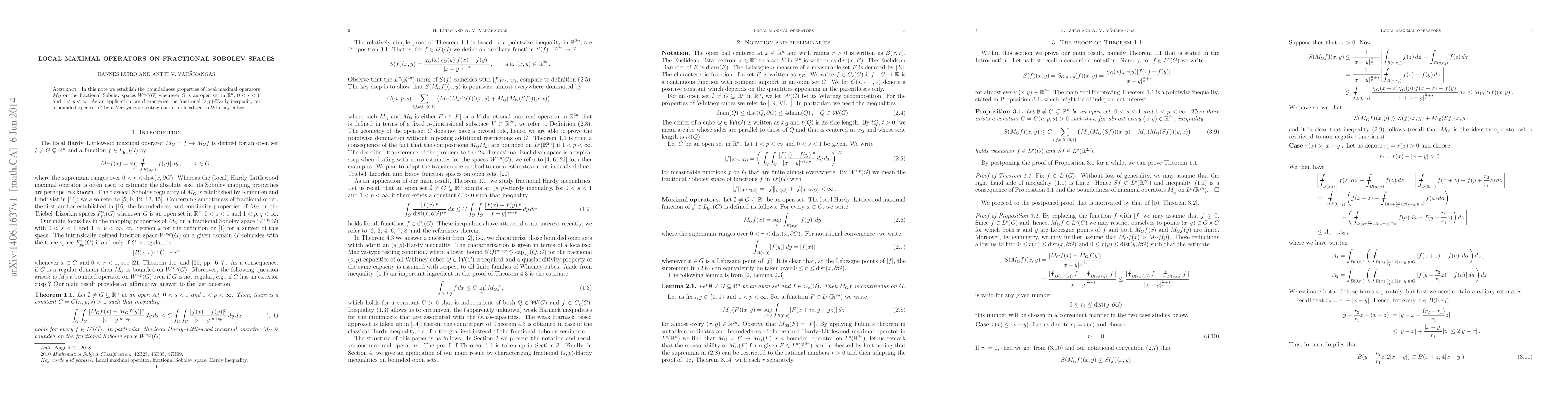 Researchers established boundedness properties of local maximal operators on fractional Sobolev spaces $W^{s,p}(G)$ for specific values of $s$ and $p$. The findings have implications for characterizing the fractional $(s,p)$-Hardy inequality with a testing condition localized to Whitney cubes.