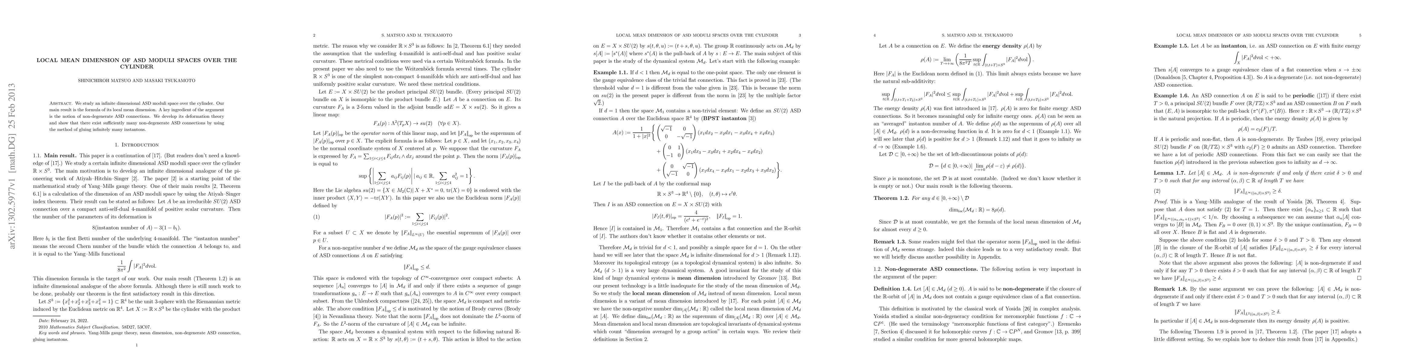 Summary: This paper derives the local mean dimension formula for an infinite-dimensional ASD moduli space over the cylinder, utilizing the deformation theory of non-degenerate ASD connections and employing the method of gluing infinitely many instantons to demonstrate the existence of such connections.