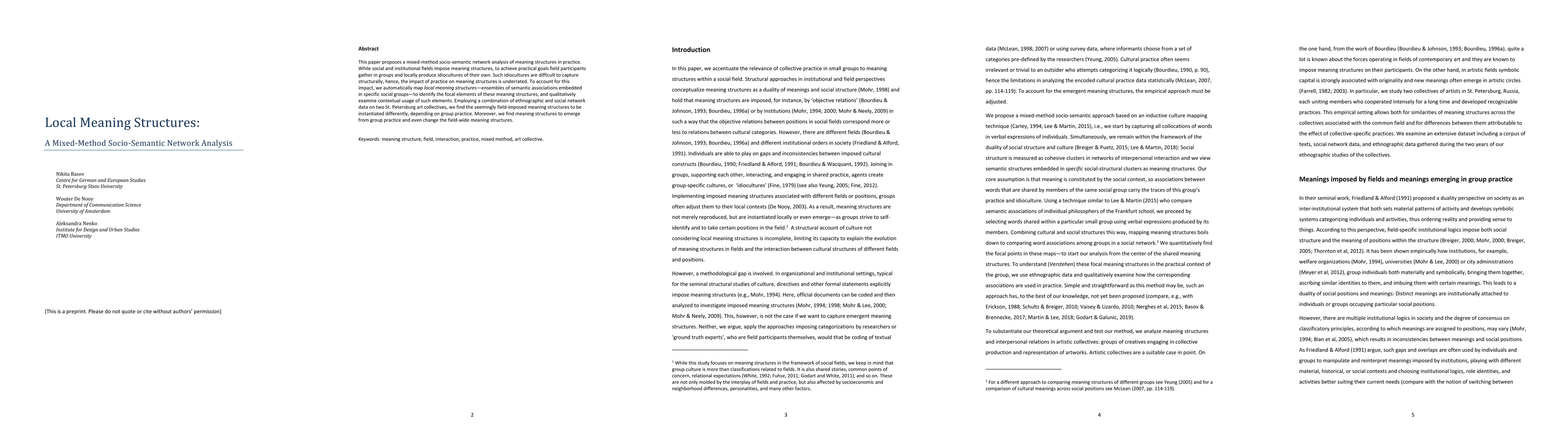 This paper uses mixed-method socio-semantic network analysis to explore how local meaning structures emerge in social groups, revealing that group practices significantly alter and shape these structures, often differing from field-imposed norms. The study combines ethnographic and social network data from St. Petersburg art collectives to demonstrate the dynamic nature of meaning structures.