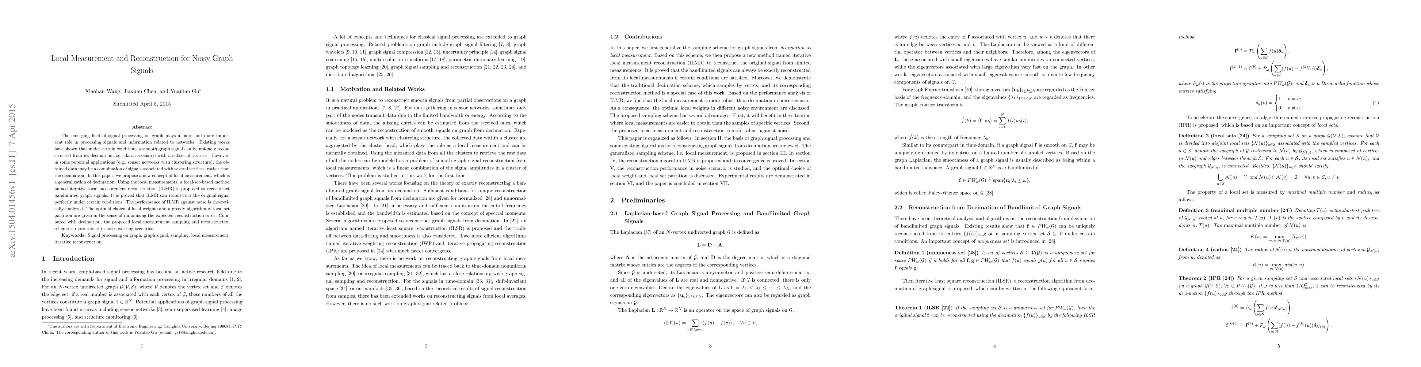 This paper introduces a new method called iterative local measurement reconstruction (ILMR) for reconstructing bandlimited graph signals from local measurements, which generalizes traditional decimation-based approaches. The proposed method is shown to be more robust to noise compared to decimation, with theoretical analysis of its performance and optimal local weight selection.