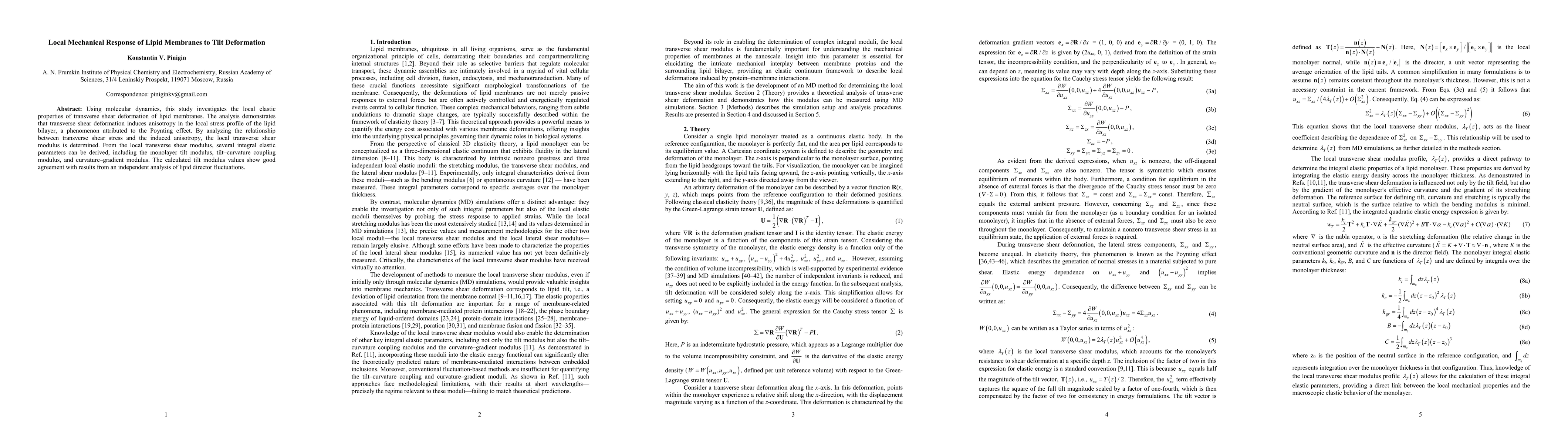Using molecular dynamics, this study investigates the local elastic properties of transverse shear deformation of lipid membranes. The analysis demonstrates that transverse shear deformation induces anisotropy in the local stress profile of the lipid bilayer, a phenomenon attributed to the Poynting effect. By analyzing the relationship between transverse shear stress and the induced anisotropy, the local transverse shear modulus is determined. From the local transverse shear modulus, several integral elastic parameters can be derived, including the monolayer tilt modulus, tilt-curvature coupling modulus, and curvature-gradient modulus. The calculated tilt modulus values show good agreement with results from an independent analysis of lipid director fluctuations.