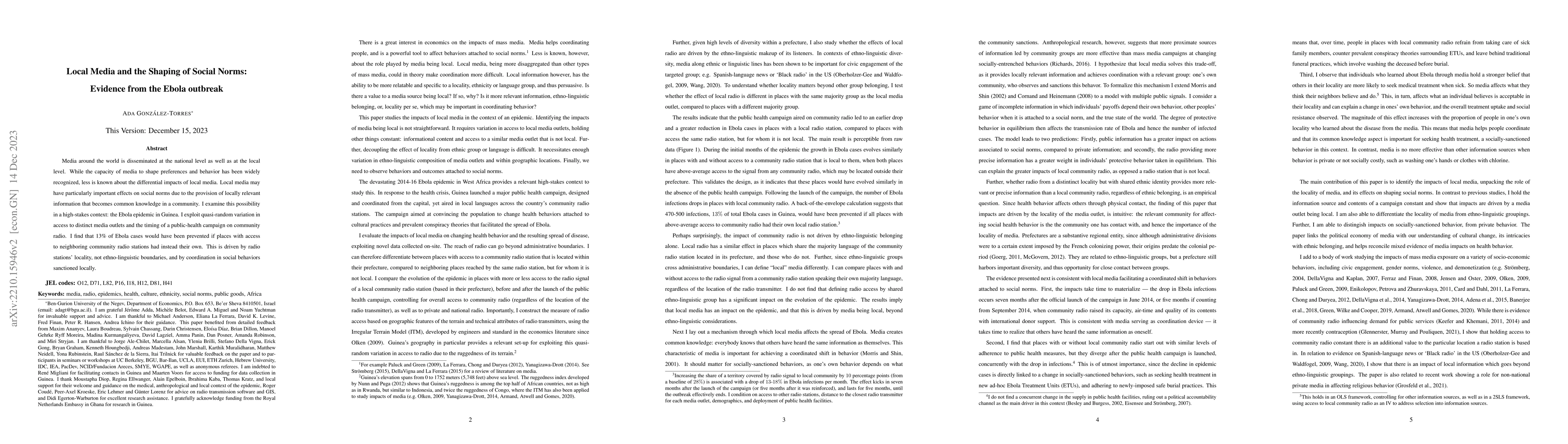 This paper investigates how local media, specifically community radio, influenced social norms during the Ebola outbreak in Guinea, finding that access to local radio stations reduced Ebola cases by 13%. The study highlights the unique role of local media in disseminating relevant information and shaping community-specific behaviors.