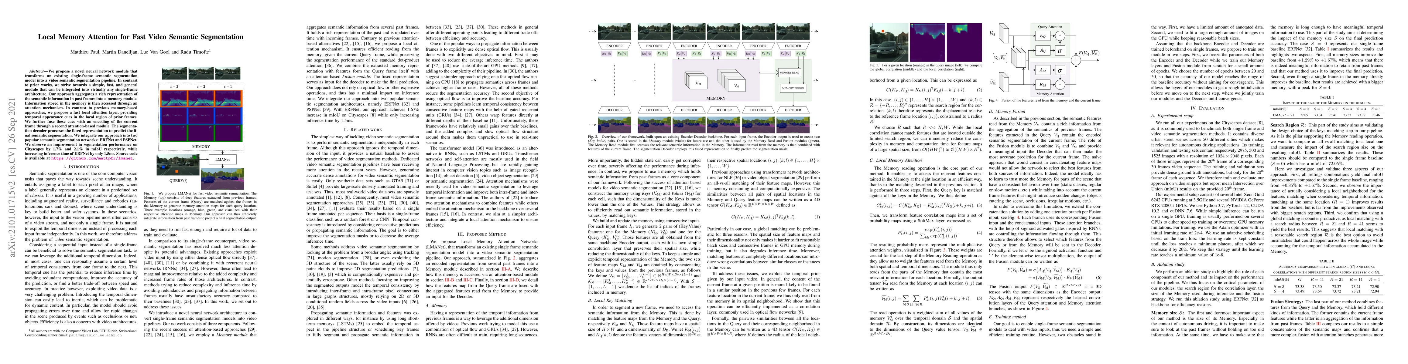 This paper introduces a local memory attention module to enhance video semantic segmentation by integrating temporal information from past frames into existing single-frame models. The approach improves segmentation performance on Cityscapes with minimal increase in inference time.