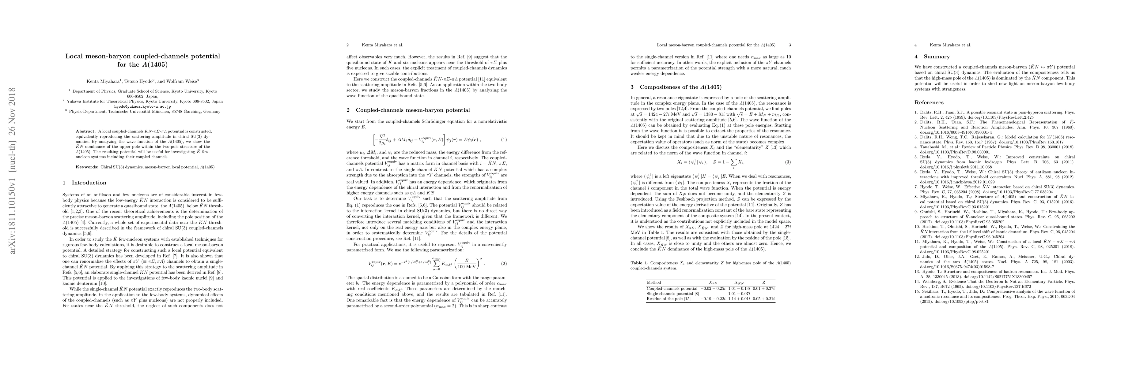 A local coupled-channels Kbar N-pi Sigma-pi Lambda potential is constructed, equivalently reproducing the scattering amplitude in chiral SU(3) dynamics. By analyzing the wave function of the Lambda(1405), we show the Kbar N dominance of the upper pole within the two-pole structure of the Lambda(1405). The resulting potential will be useful for investigating Kbar few-nucleon systems including their coupled channels.