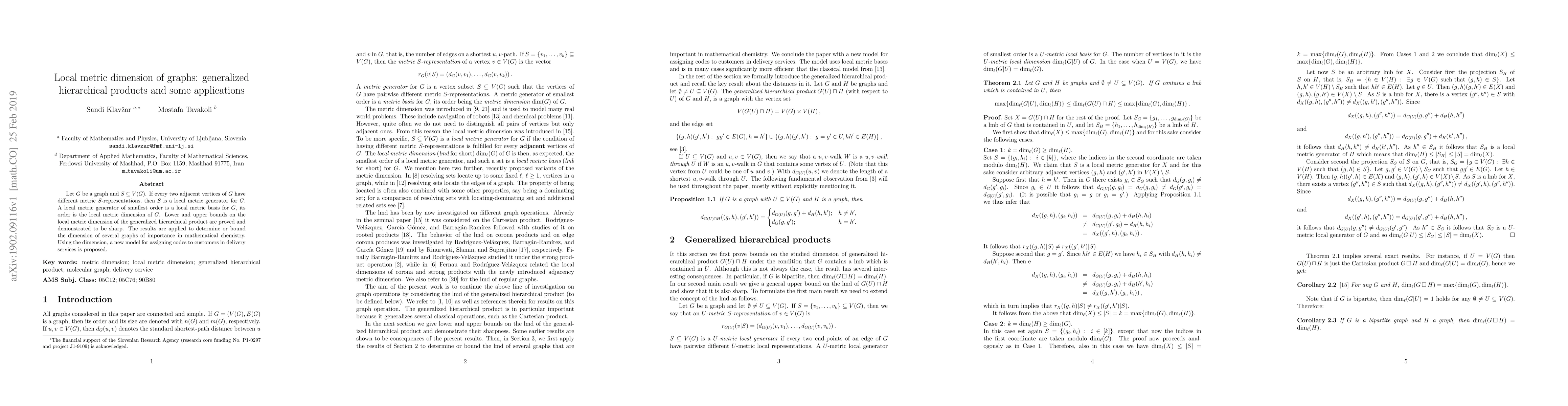Let $G$ be a graph and $S\subseteq V(G)$. If every two adjacent vertices of $G$ have different metric $S$-representations, then $S$ is a local metric generator for $G$. A local metric generator of smallest order is a local metric basis for $G$, its order is the local metric dimension of $G$. Lower and upper bounds on the local metric dimension of the generalized hierarchical product are proved and demonstrated to be sharp. The results are applied to determine or bound the dimension of several graphs of importance in mathematical chemistry. Using the dimension, a new model for assigning codes to customers in delivery services is proposed.