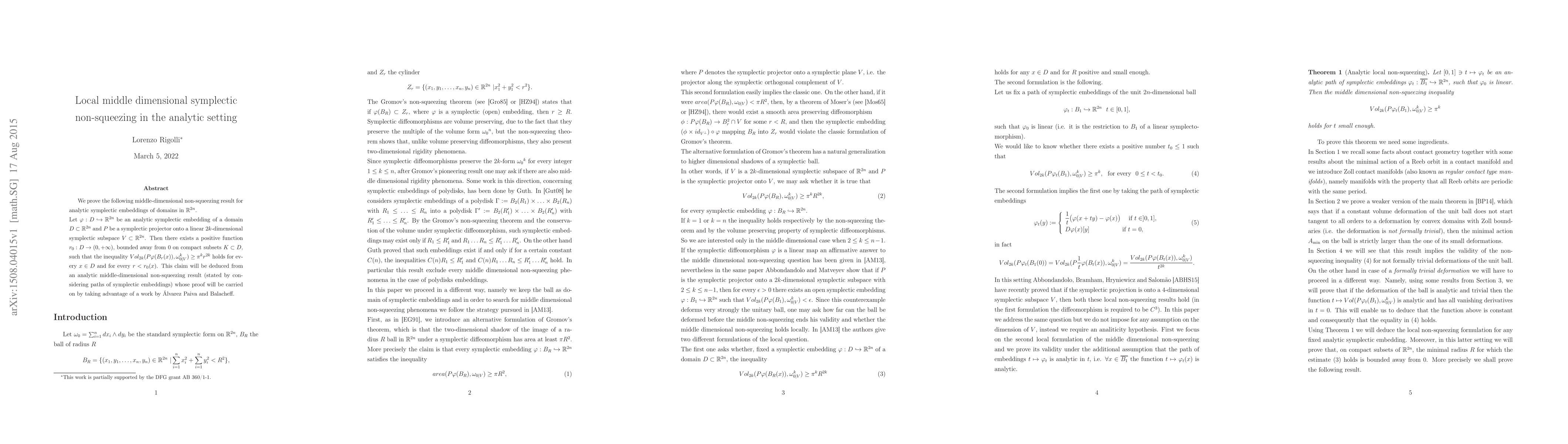 This paper proves a middle-dimensional non-squeezing result for analytic symplectic embeddings in $\mathbb{R}^{2n}$, showing that certain volumes cannot be squeezed into smaller dimensions. The result is derived from an analytic middle-dimensional non-squeezing theorem using techniques from a work by Álvarez Paiva and Balacheff.