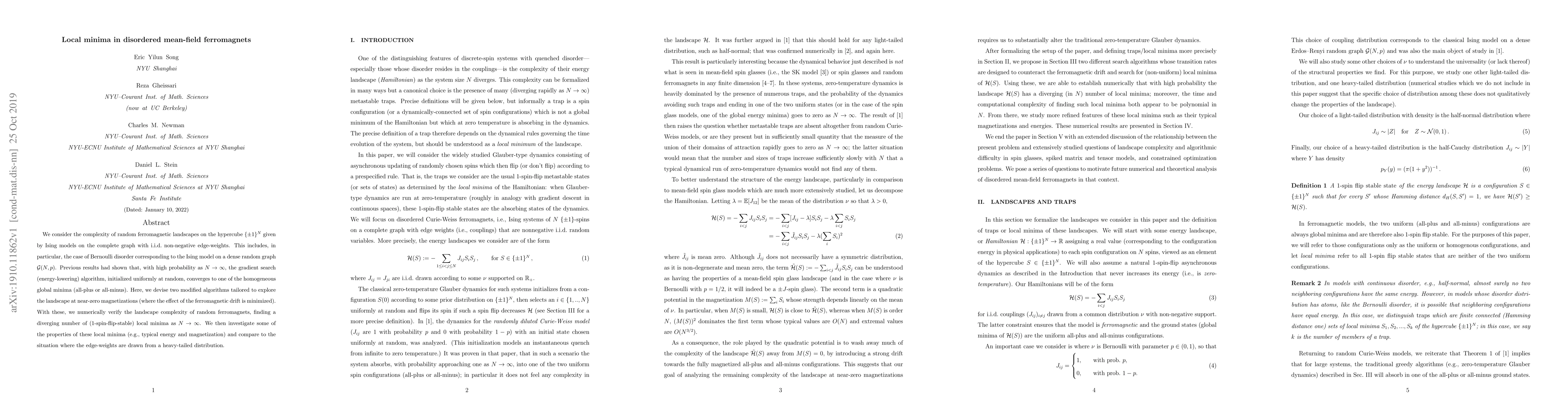 Researchers studied ferromagnetic landscapes on hypercubes with random edge-weights, finding a diverging number of local minima as the size increases. They also explored properties of these local minima and compared to cases with heavy-tailed distributions.