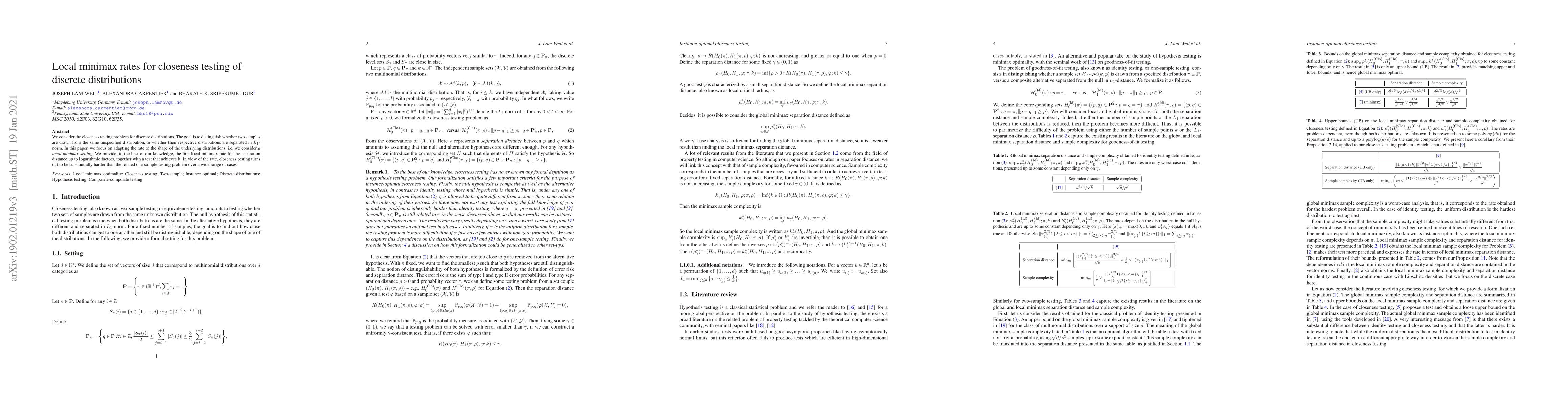 This paper establishes the first local minimax rate for closeness testing of discrete distributions, providing a test that achieves this rate. It shows that distinguishing between two samples in a local minimax setting is significantly more challenging than the one-sample testing problem.