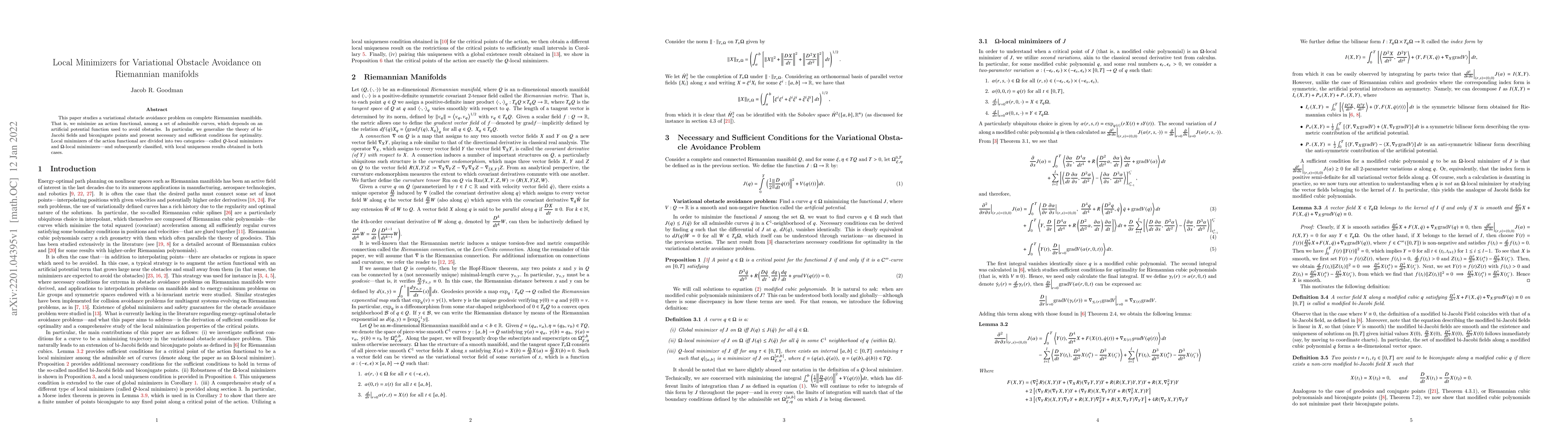 This paper studies a variational obstacle avoidance problem on complete Riemannian manifolds. That is, we minimize an action functional, among a set of admissible curves, which depends on an artificial potential function used to avoid obstacles. In particular, we generalize the theory of bi-Jacobi fields and biconjugate points and present necessary and sufficient conditions for optimality. Local minimizers of the action functional are divided into two categories and subsequently classified, with local uniqueness results obtained in both cases.