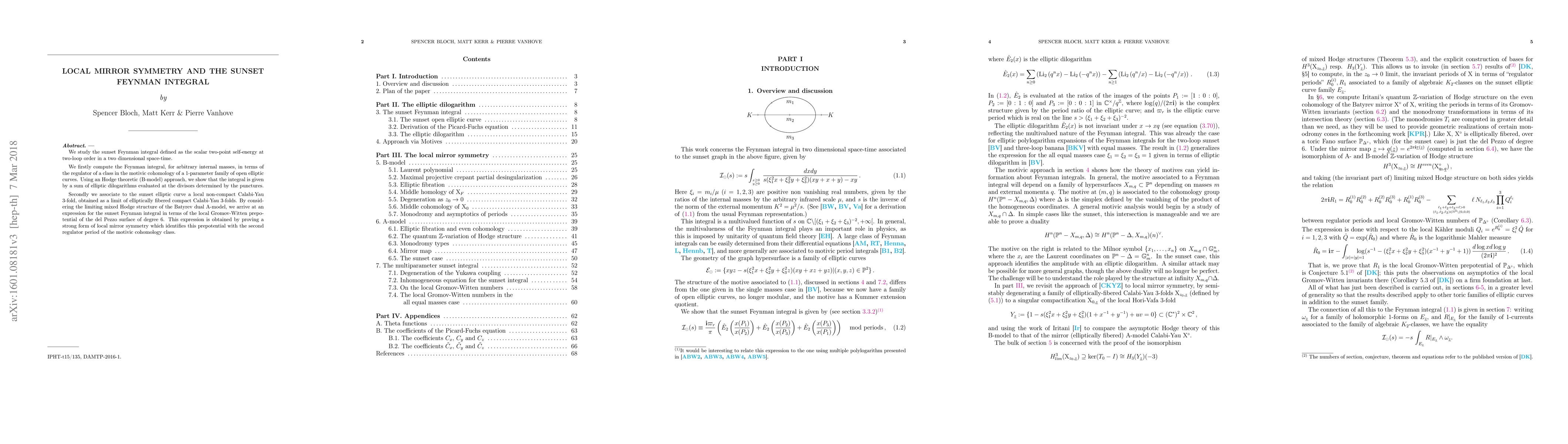 This paper computes the sunset Feynman integral, a two-loop, two-dimensional scalar self-energy, using motivic cohomology and elliptic curves. It then establishes a local mirror symmetry, linking the integral to the Gromov-Witten prepotential of a del Pezzo surface, thereby connecting particle physics and string theory.