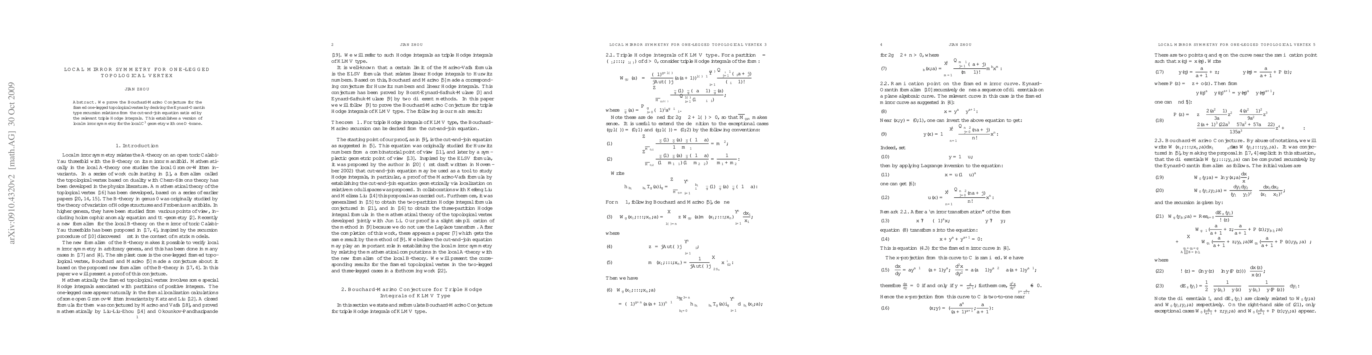 This paper proves the Bouchard-Mari~no Conjecture for the framed one-legged topological vertex, establishing local mirror symmetry through recursion relations derived from the cut-and-join equation for triple Hodge integrals, applicable to local $C^3$ geometry with one D-brane.