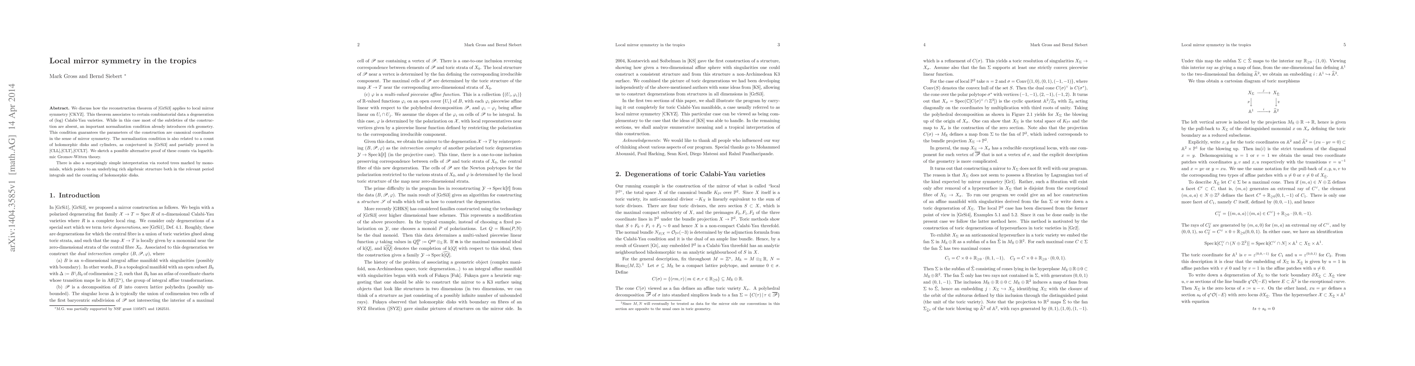We discuss how the Gross-Siebert reconstruction theorem applies to the local mirror symmetry of Chiang, Klemm, Yau and Zaslow. The reconstruction theorem associates to certain combinatorial data a degeneration of (log) Calabi-Yau varieties. While in this case most of the subtleties of the construction are absent, an important normalization condition already introduces rich geometry. This condition guarantees the parameters of the construction are canonical coordinates in the sense of mirror symmetry. The normalization condition is also related to a count of holomorphic disks and cylinders, as conjectured in our work and partially proved in various works of Chan, Cho, Lau, Leung and Tseng. We sketch a possible alternative proof of these counts via logarithmic Gromov-Witten theory. There is also a surprisingly simple interpretation via rooted trees marked by monomials, which points to an underlying rich algebraic structure both in the relevant period integrals and the counting of holomorphic disks.