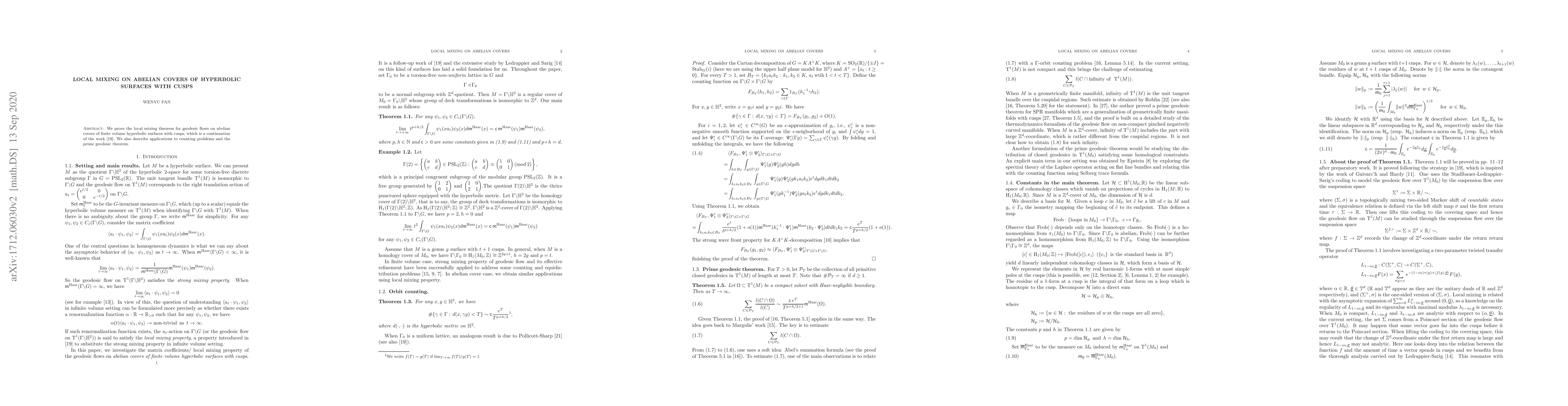 This paper proves the local mixing theorem for geodesic flows on abelian covers of finite volume hyperbolic surfaces with cusps, extending previous work by Oh-Pan. It also explores applications to counting problems and the prime geodesic theorem.