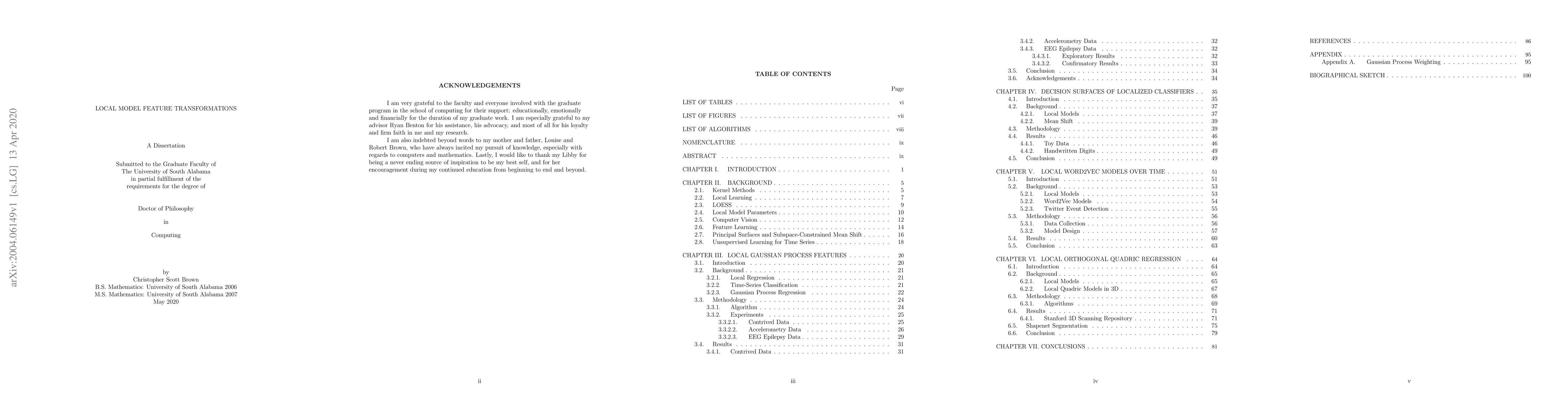 Local learning methods are a popular class of machine learning algorithms. The basic idea for the entire cadre is to choose some non-local model family, to train many of them on small sections of neighboring data, and then to `stitch' the resulting models together in some way. Due to the limits of constraining a training dataset to a small neighborhood, research on locally-learned models has largely been restricted to simple model families. Also, since simple model families have no complex structure by design, this has limited use of the individual local models to predictive tasks. We hypothesize that, using a sufficiently complex local model family, various properties of the individual local models, such as their learned parameters, can be used as features for further learning. This dissertation improves upon the current state of research and works toward establishing this hypothesis by investigating algorithms for localization of more complex model families and by studying their applications beyond predictions as a feature extraction mechanism. We summarize this generic technique of using local models as a feature extraction step with the term ``local model feature transformations.'' In this document, we extend the local modeling paradigm to Gaussian processes, orthogonal quadric models and word embedding models, and extend the existing theory for localized linear classifiers. We then demonstrate applications of local model feature transformations to epileptic event classification from EEG readings, activity monitoring via chest accelerometry, 3D surface reconstruction, 3D point cloud segmentation, handwritten digit classification and event detection from Twitter feeds.