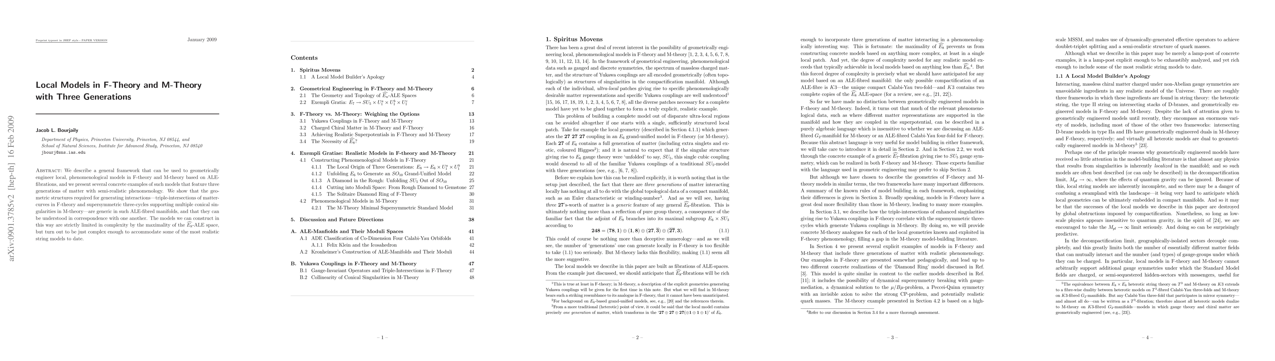 This paper outlines a framework for creating local models in F-theory and M-theory using ALE-fibrations, providing examples with three generations of matter. It shows that required geometric structures for interactions are common in these fibrations and can correspond between F-theory and M-theory. The models, while limited by E8-ALE space maximality, are complex enough to accommodate some of the most realistic string models to date.