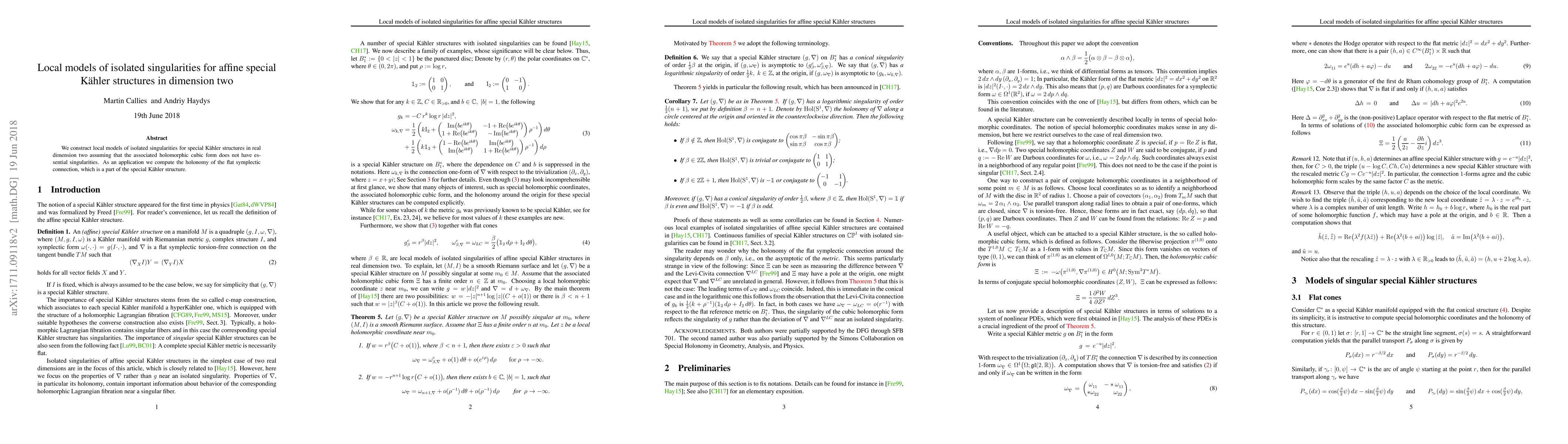 We construct local models of isolated singularities for special K\"ahler structures in real dimension two assuming that the associated holomorphic cubic form does not have essential singularities. As an application we compute the holonomy of the flat symplectic connection, which is a part of the special K\"ahler structure.