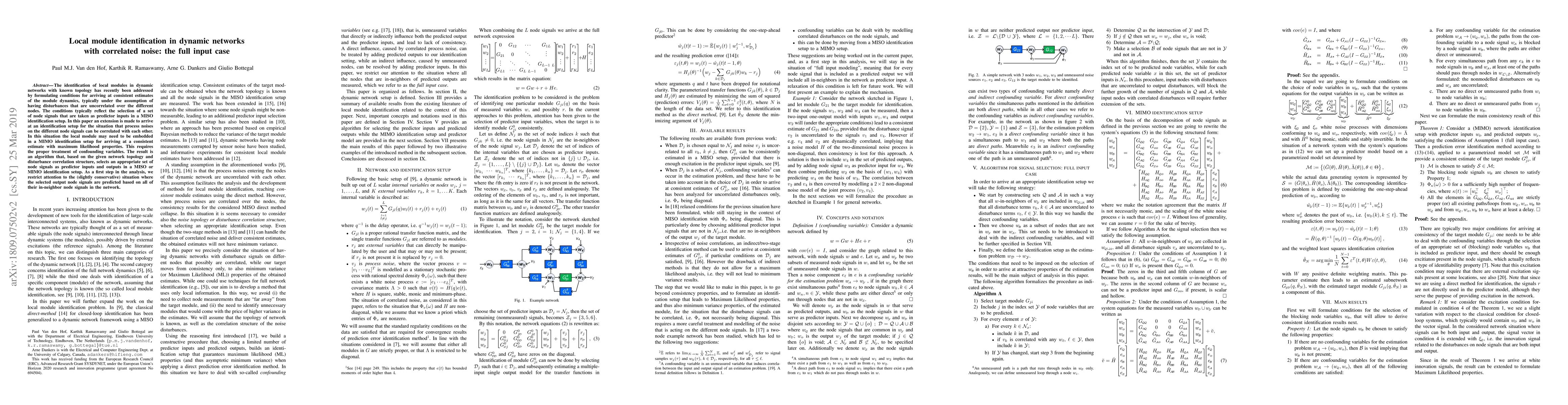 This paper proposes an algorithm for identifying local modules in dynamic networks where node disturbances can be correlated. It extends existing methods to a MISO or MIMO setup, ensuring consistent estimates through proper treatment of confounding variables, and focuses initially on predicting output nodes based on all in-neighbor signals.