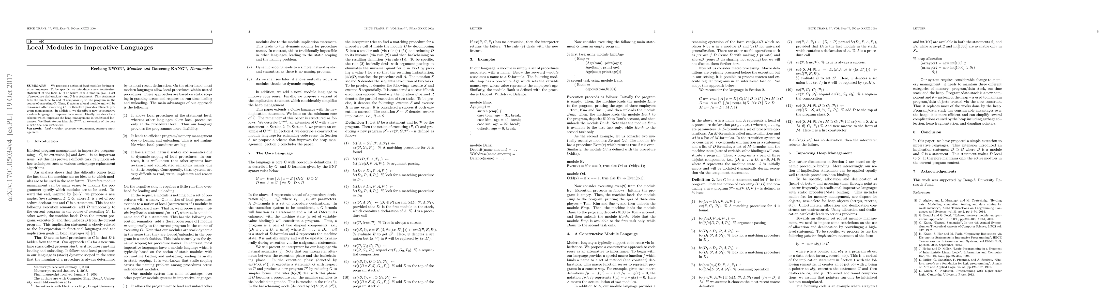 This paper introduces local modules for imperative languages, allowing temporary addition of procedure declarations during statement execution, enhancing module management and efficiency. The concept is demonstrated through C^{mod}, an extension of C, and a new module language for better code reuse, along with an improved heap management scheme.