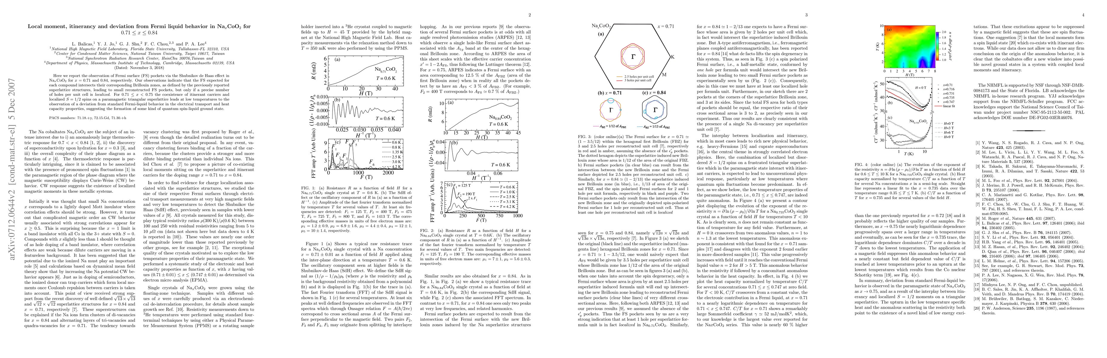 Here we report the observation of Fermi surface (FS) pockets via the Shubnikov de Haas effect in Na$_x$CoO$_2$ for $x = 0.71$ and 0.84, respectively. Our observations indicate that the FS expected for each compound intersects their corresponding Brillouin zones, as defined by the previously reported superlattice structures, leading to small reconstructed FS pockets, but only if a precise number of holes per unit cell is \emph{localized}. For $0.71 \leq x < 0.75$ the coexistence of itinerant carriers and localized $S =1/2$ spins on a paramagnetic triangular superlattice leads at low temperatures to the observation of a deviation from standard Fermi-liquid behavior in the electrical transport and heat capacity properties, suggesting the formation of some kind of quantum spin-liquid ground state.