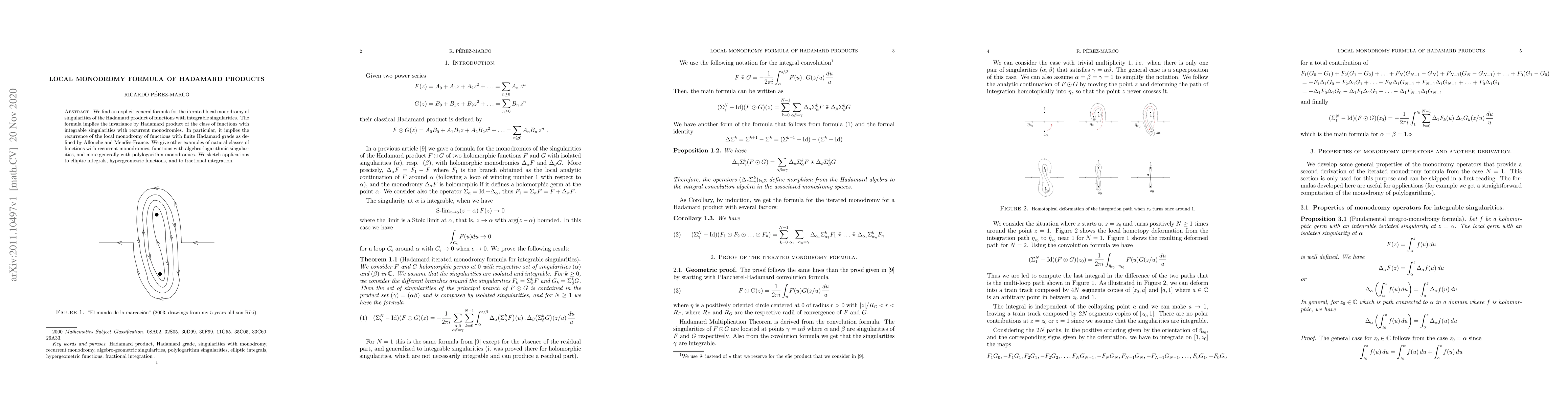 We find an explicit general formula for the iterated local monodromy of singularities of the Hadamard product of functions with integrable singularities. The formula implies the invariance by Hadamard product of the class of functions with integrable singularities with recurrent monodromies. In particular, it implies the recurrence of the local monodromy of functions with finite Hadamard grade as defined by Allouche and Mend\`es-France. We give other examples of natural classes of functions with recurrent monodromies, functions with algebro-logarithmic singularities, and more generally with polylogarithm monodromies. We sketch applications to elliptic integrals, hypergeometric functions, and to fractional integration.