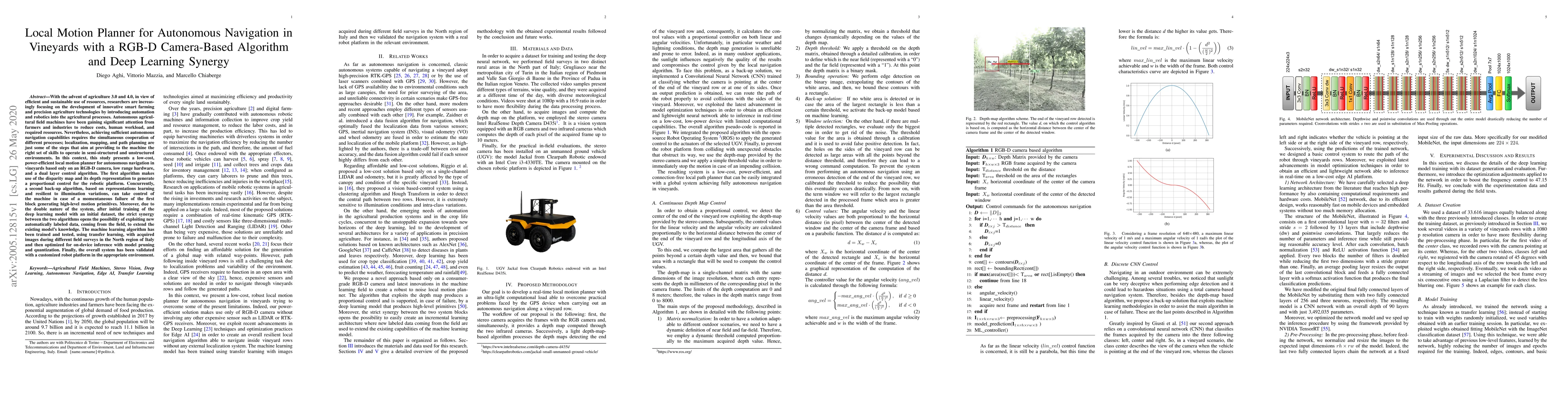 With the advent of agriculture 3.0 and 4.0, researchers are increasingly focusing on the development of innovative smart farming and precision agriculture technologies by introducing automation and robotics into the agricultural processes. Autonomous agricultural field machines have been gaining significant attention from farmers and industries to reduce costs, human workload, and required resources. Nevertheless, achieving sufficient autonomous navigation capabilities requires the simultaneous cooperation of different processes; localization, mapping, and path planning are just some of the steps that aim at providing to the machine the right set of skills to operate in semi-structured and unstructured environments. In this context, this study presents a low-cost local motion planner for autonomous navigation in vineyards based only on an RGB-D camera, low range hardware, and a dual layer control algorithm. The first algorithm exploits the disparity map and its depth representation to generate a proportional control for the robotic platform. Concurrently, a second back-up algorithm, based on representations learning and resilient to illumination variations, can take control of the machine in case of a momentaneous failure of the first block. Moreover, due to the double nature of the system, after initial training of the deep learning model with an initial dataset, the strict synergy between the two algorithms opens the possibility of exploiting new automatically labeled data, coming from the field, to extend the existing model knowledge. The machine learning algorithm has been trained and tested, using transfer learning, with acquired images during different field surveys in the North region of Italy and then optimized for on-device inference with model pruning and quantization. Finally, the overall system has been validated with a customized robot platform in the relevant environment.