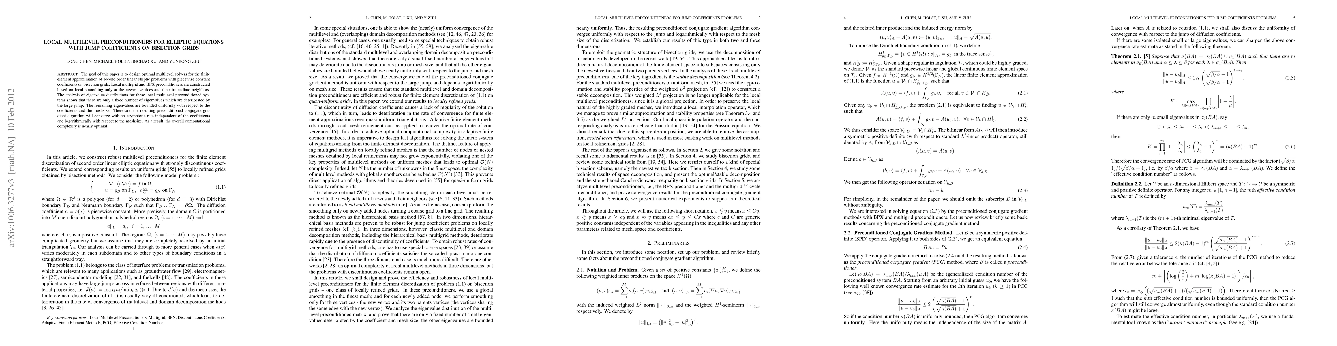 This paper develops optimal multilevel solvers for elliptic equations with piecewise constant coefficients using local multigrid and BPX preconditioners. The analysis reveals that only a few eigenvalues are affected by coefficient jumps, while others remain uniformly bounded, ensuring convergence of the preconditioned conjugate gradient algorithm with nearly optimal complexity.
