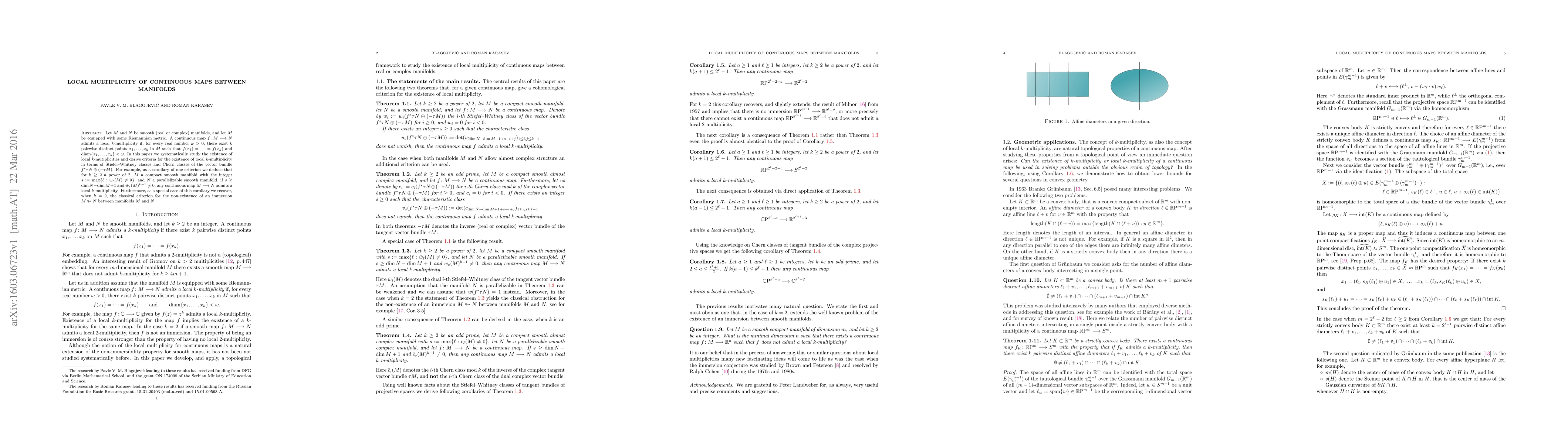 Researchers study local multiplicity of continuous maps between manifolds and derive criteria for existence in terms of Stiefel-Whitney and Chern classes, leading to new insights into the conditions under which such maps admit multiple points.