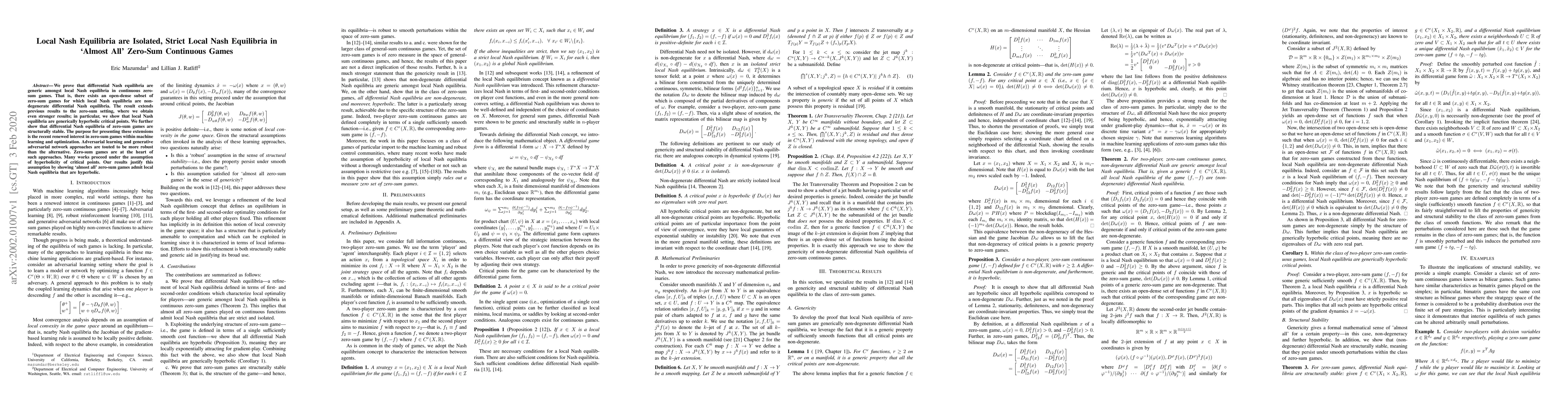 This paper demonstrates that in continuous zero-sum games, local Nash equilibria are typically strict and hyperbolic, providing structural stability for these equilibria. The findings support the robustness assumptions in adversarial learning and optimization methods.