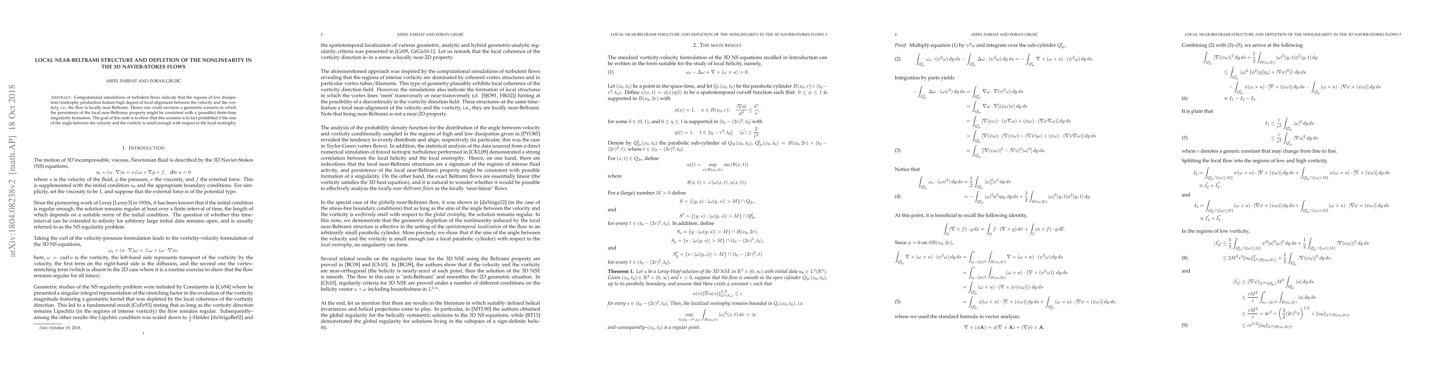 Computational simulations show that low-dissipation regions in turbulent flows exhibit near-Beltrami structure, but small-angle vorticity-velocity alignment limits the formation of finite-time singularities.