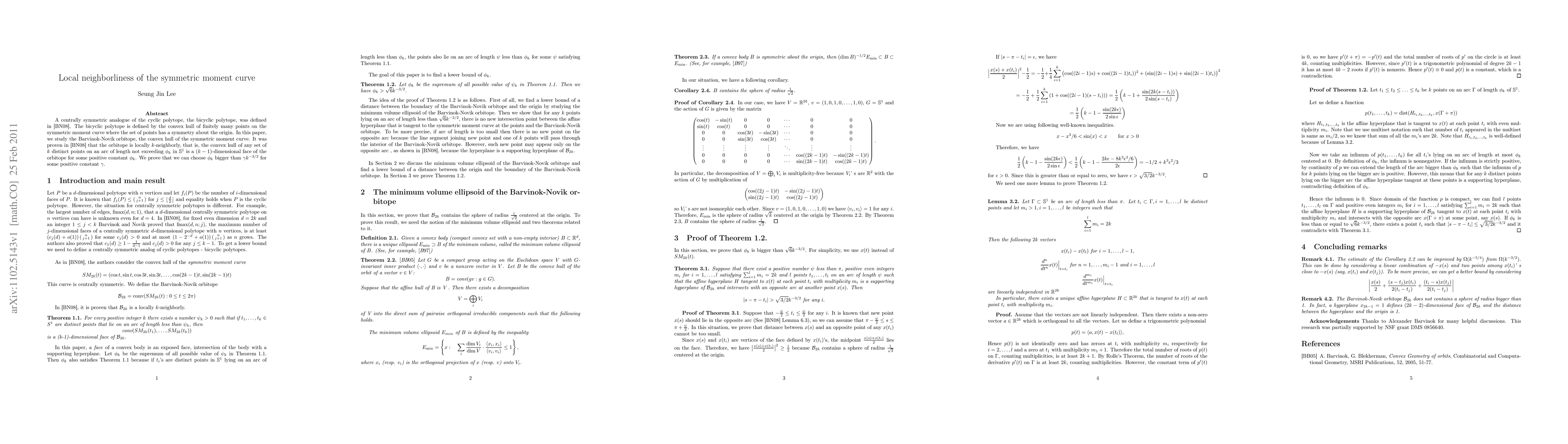 A centrally symmetric analogue of the cyclic polytope, the bicyclic polytope, was defined in [BN08]. The bicyclic polytope is defined by the convex hull of finitely many points on the symmetric moment curve where the set of points has a symmetry about the origin. In this paper, we study the Barvinok-Novik orbitope, the convex hull of the symmetric moment curve. It was proven in [BN08] that the orbitope is locally $k$-neighborly, that is, the convex hull of any set of $k$ distinct points on an arc of length not exceeding $\phi_k$ in $\mathbb{S}^1$ is a $(k-1)$-dimensional face of the orbitope for some positive constant $\phi_k$. We prove that we can choose $\phi_k $ bigger than $\gamma k^{-3/2} $ for some positive constant $\gamma$.