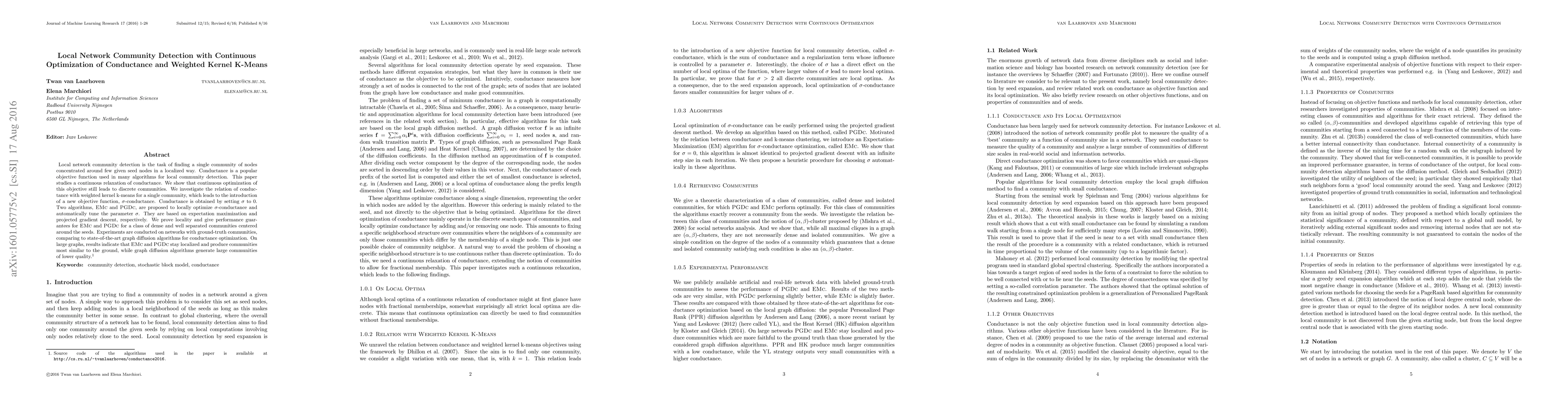 Local network community detection is the task of finding a single community of nodes concentrated around few given seed nodes in a localized way. Conductance is a popular objective function used in many algorithms for local community detection. This paper studies a continuous relaxation of conductance. We show that continuous optimization of this objective still leads to discrete communities. We investigate the relation of conductance with weighted kernel k-means for a single community, which leads to the introduction of a new objective function, $\sigma$-conductance. Conductance is obtained by setting $\sigma$ to $0$. Two algorithms, EMc and PGDc, are proposed to locally optimize $\sigma$-conductance and automatically tune the parameter $\sigma$. They are based on expectation maximization and projected gradient descent, respectively. We prove locality and give performance guarantees for EMc and PGDc for a class of dense and well separated communities centered around the seeds. Experiments are conducted on networks with ground-truth communities, comparing to state-of-the-art graph diffusion algorithms for conductance optimization. On large graphs, results indicate that EMc and PGDc stay localized and produce communities most similar to the ground, while graph diffusion algorithms generate large communities of lower quality.