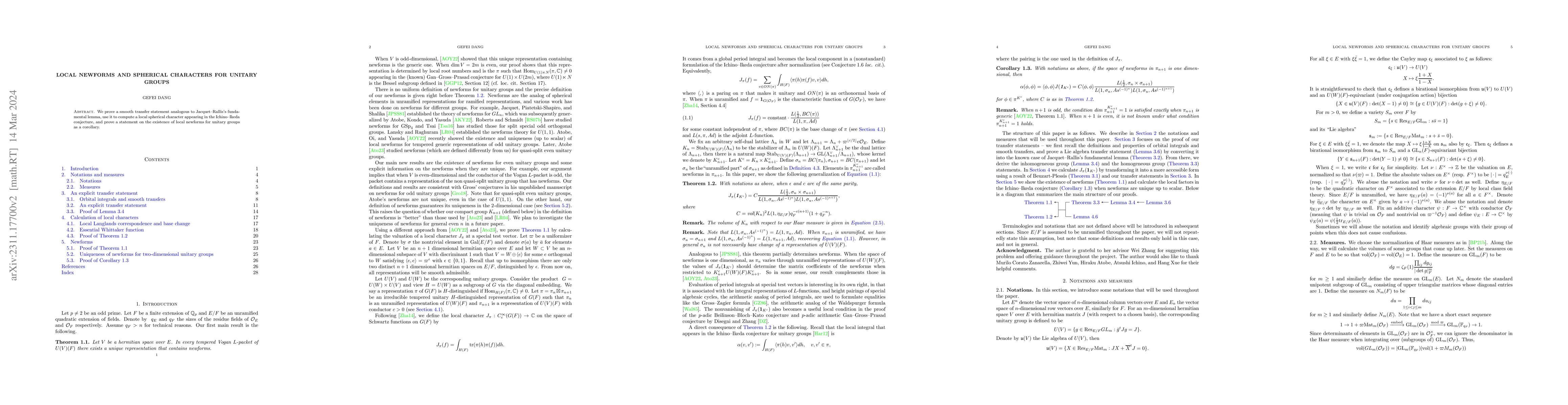 This paper proves a smooth transfer analogous to Jacquet-Rallis's fundamental lemma and uses it to compute a local spherical character, thereby establishing the existence of local newforms for unitary groups.
