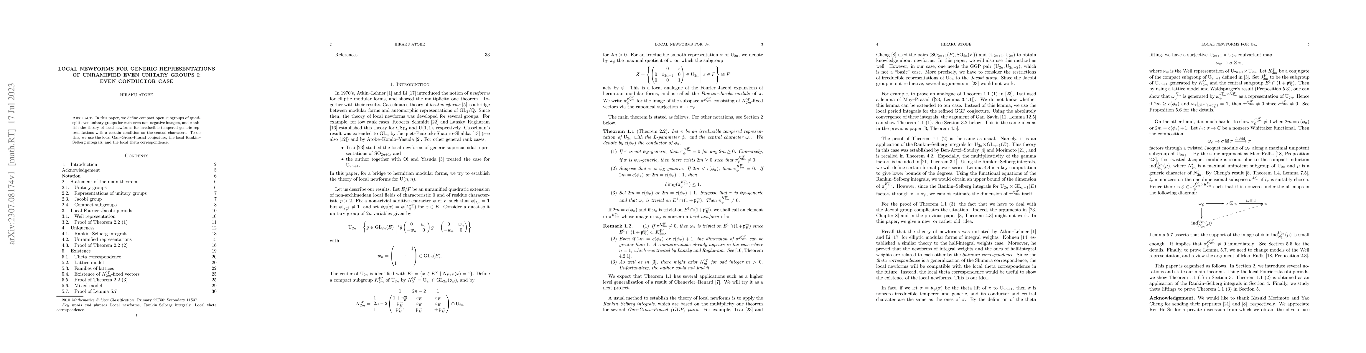 This paper develops a theory of local newforms for irreducible tempered generic representations of quasi-split even unitary groups, utilizing compact open subgroups defined for even conductors, alongside local Gan-Gross-Prasad conjecture, Rankin-Selberg integrals, and the local theta correspondence.